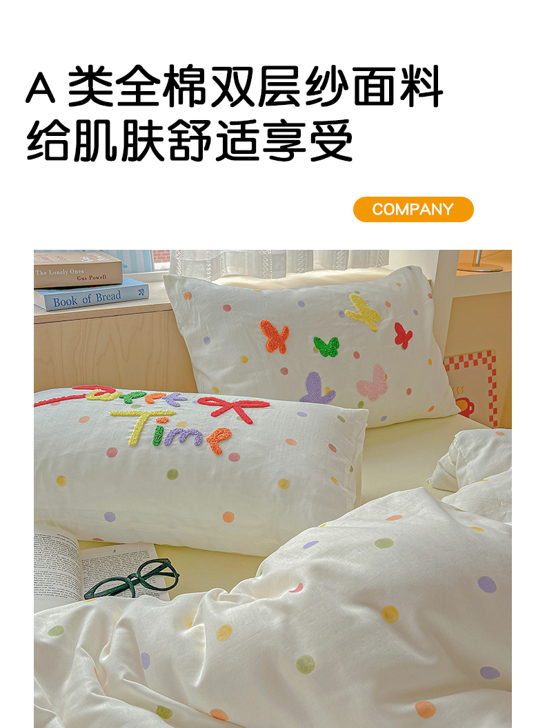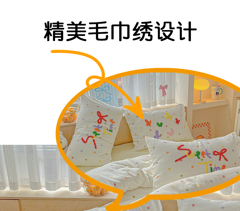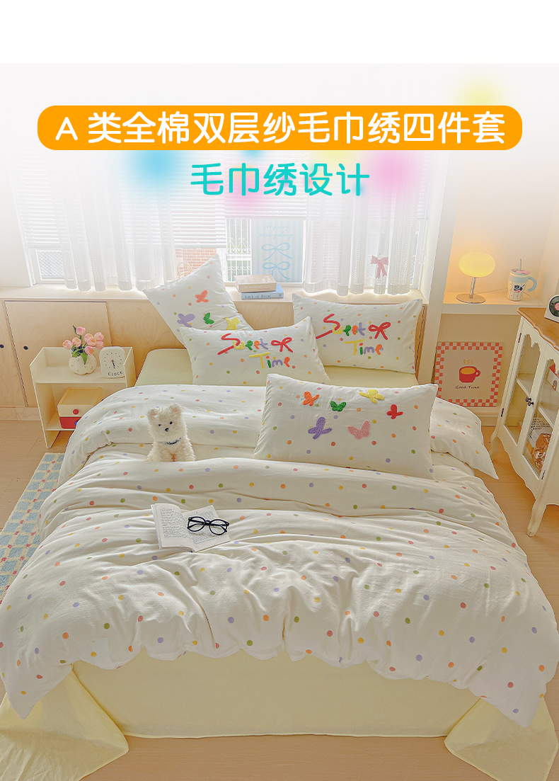 商品名称:静家居-简约原创家纺 2025新款A类全棉双层纱sweet毛巾绣四件套 大彩