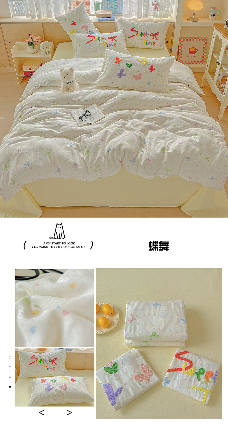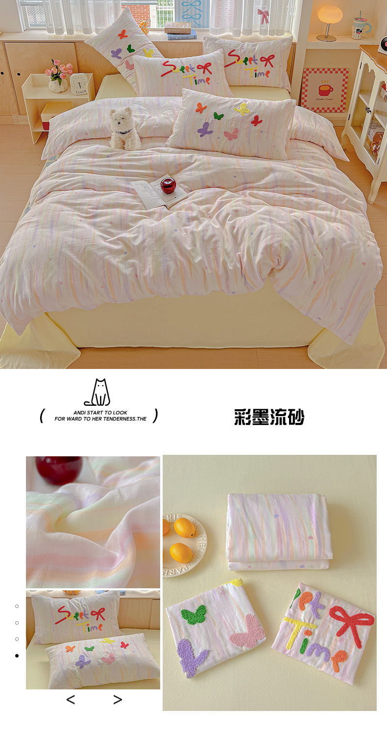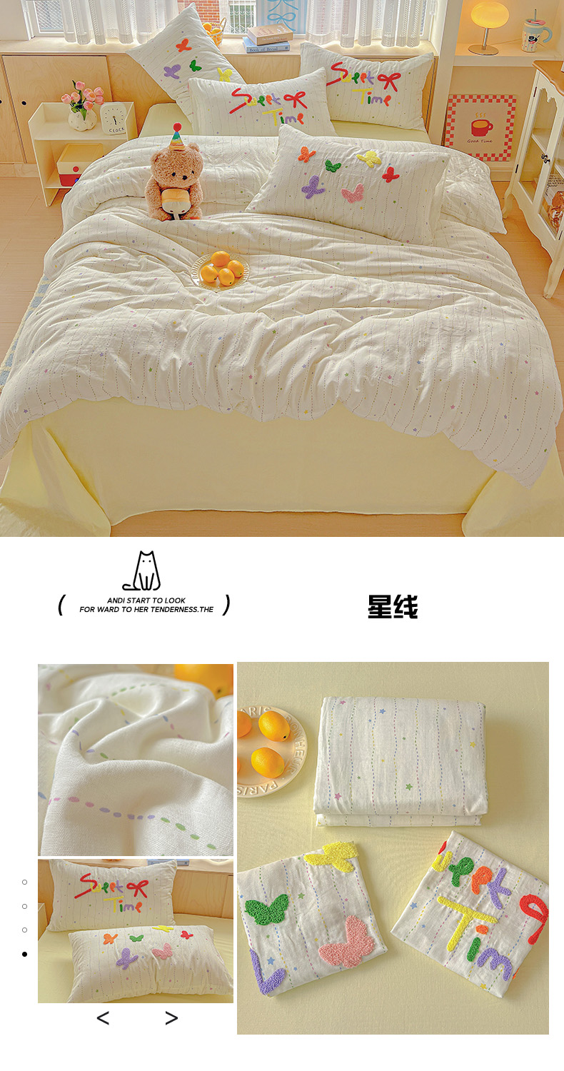 (总)静家居-简约原创家纺 2025新款A类全棉双层纱sweet毛巾绣四件套,彩墨流砂,大彩,蝶舞,小熊软糖,星线