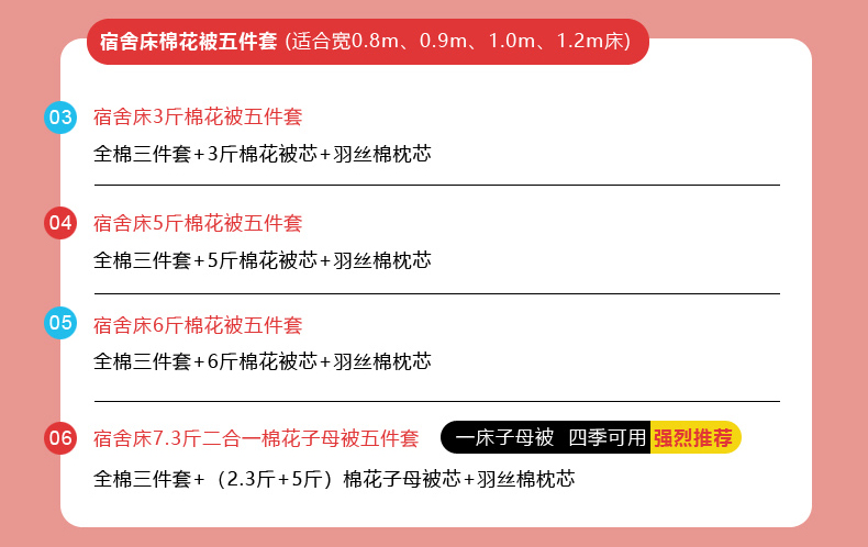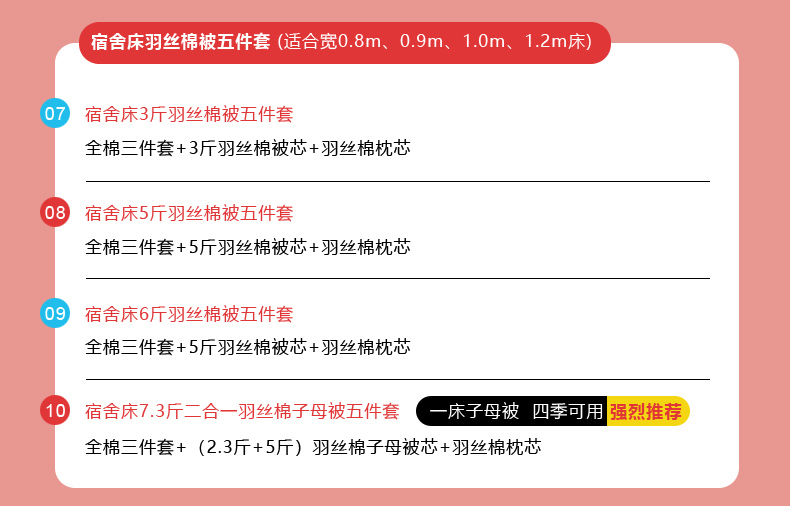 【床单款】0.9m床7.3斤羽丝棉子母被五件套 | ¥173.00 |