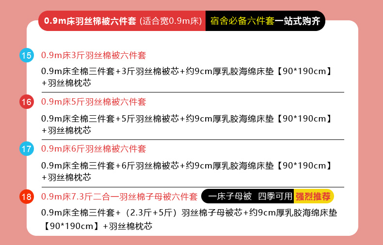 【海绵床垫床单款】0.9m床3斤羽丝棉被六件套 | ¥207.00 |