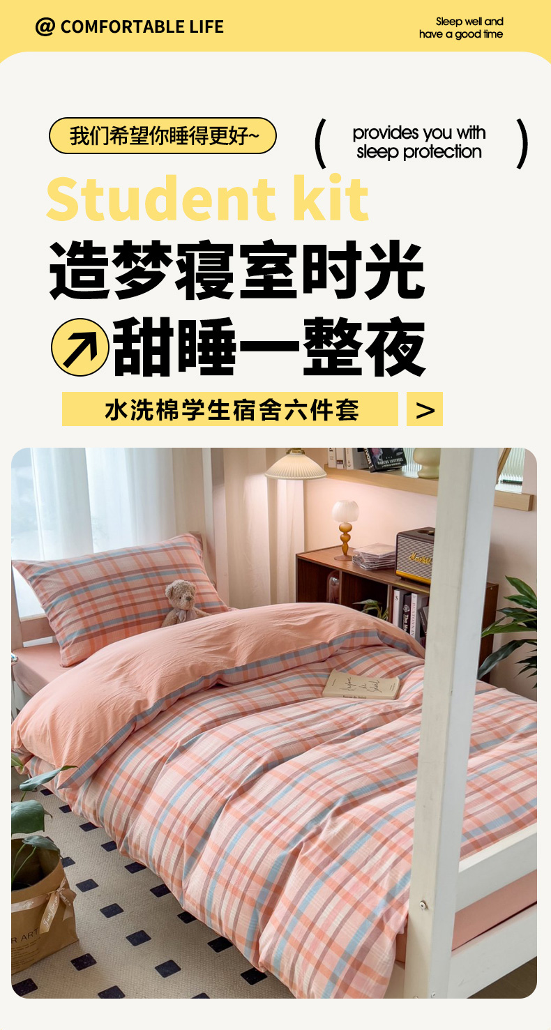 宝士康家纺 2025新款亲肤水洗棉学生床笠款六件套 英伦粉