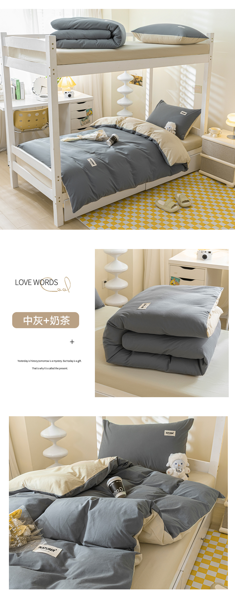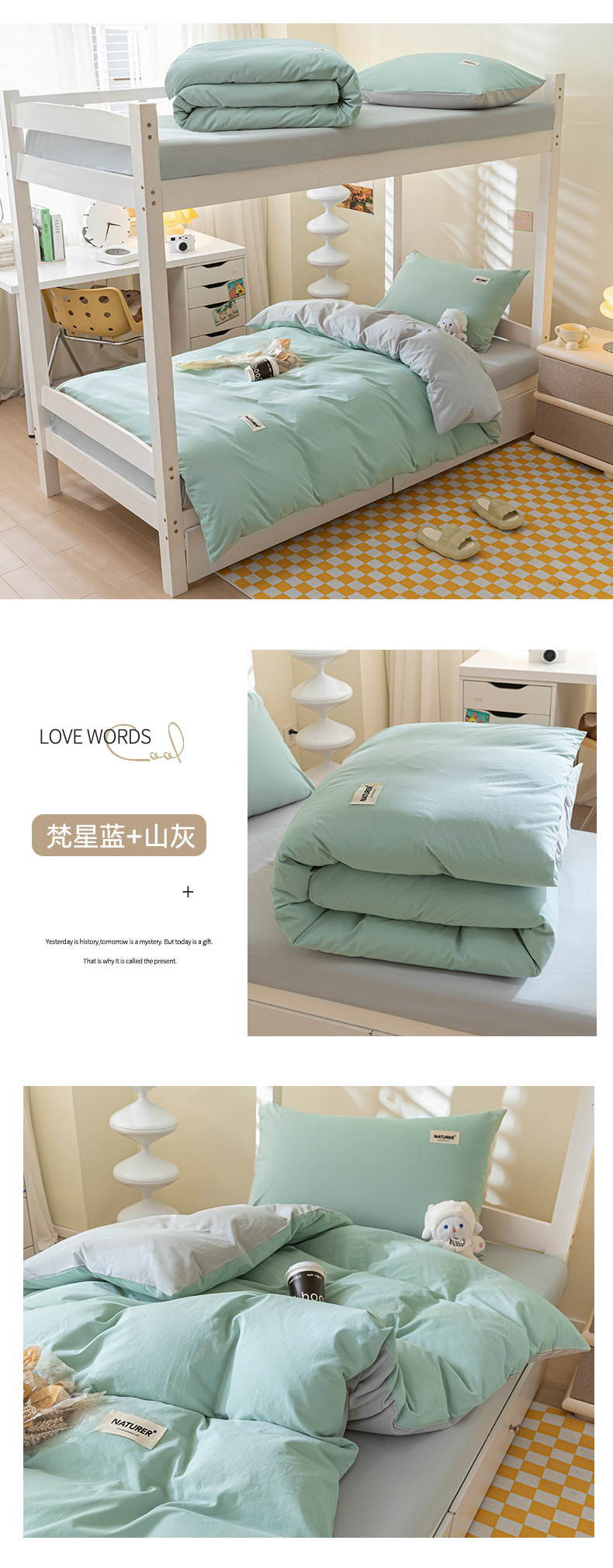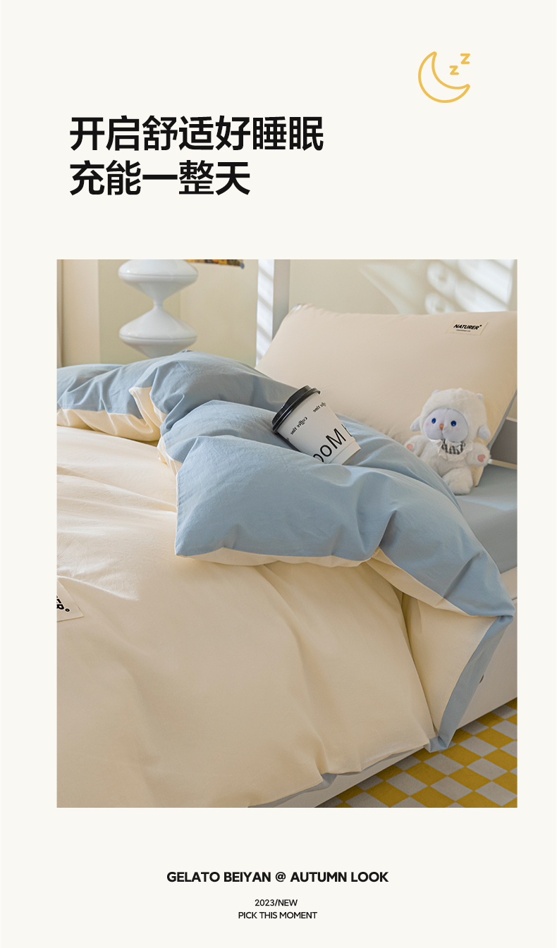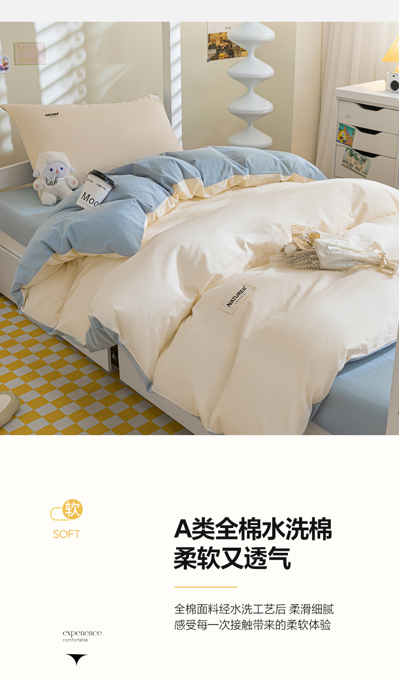 佳汐蓝家纺 2025新款A类全棉水洗棉学生三件套 贴标-奶昔白+海青