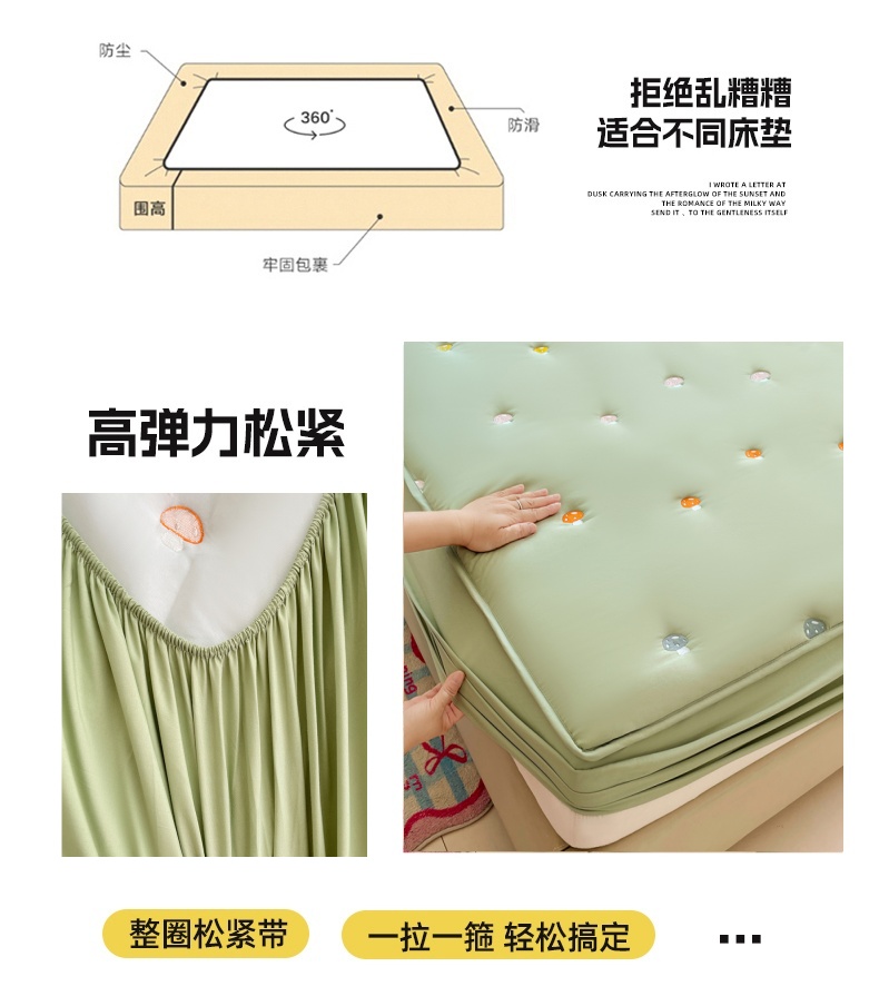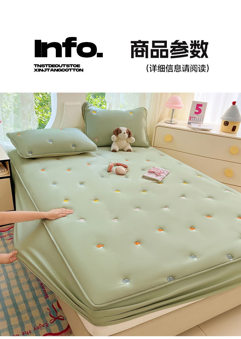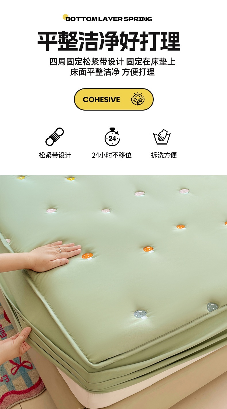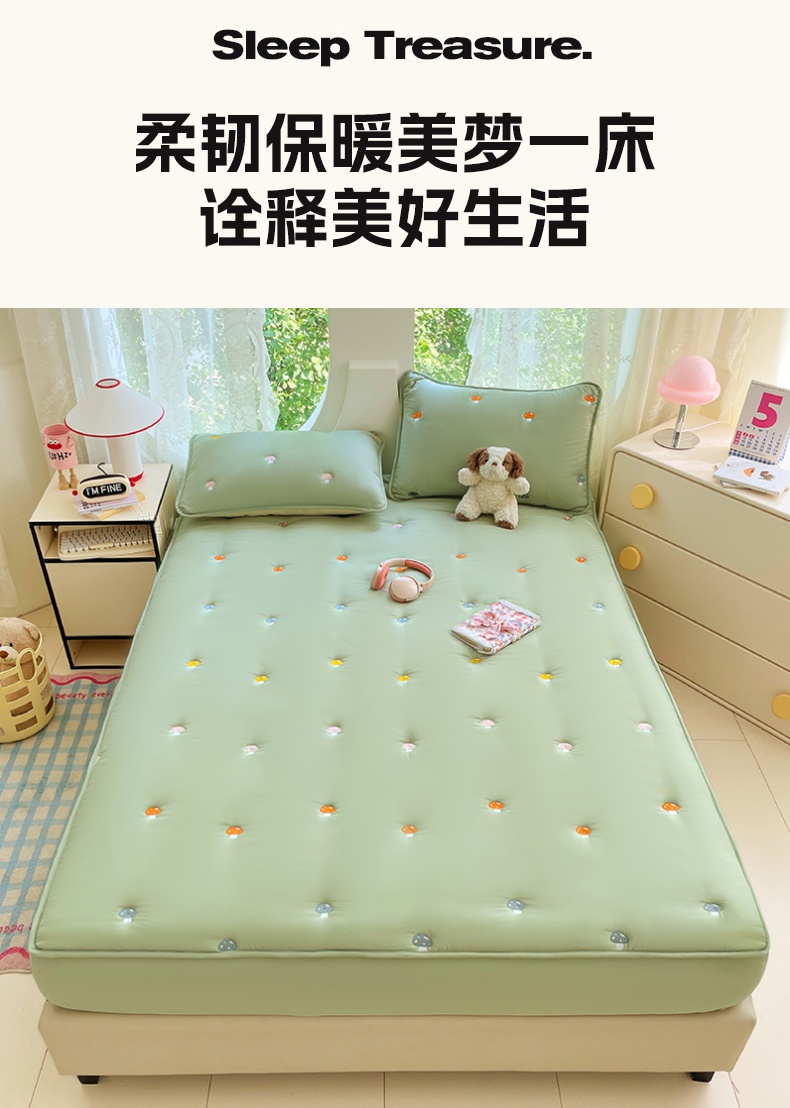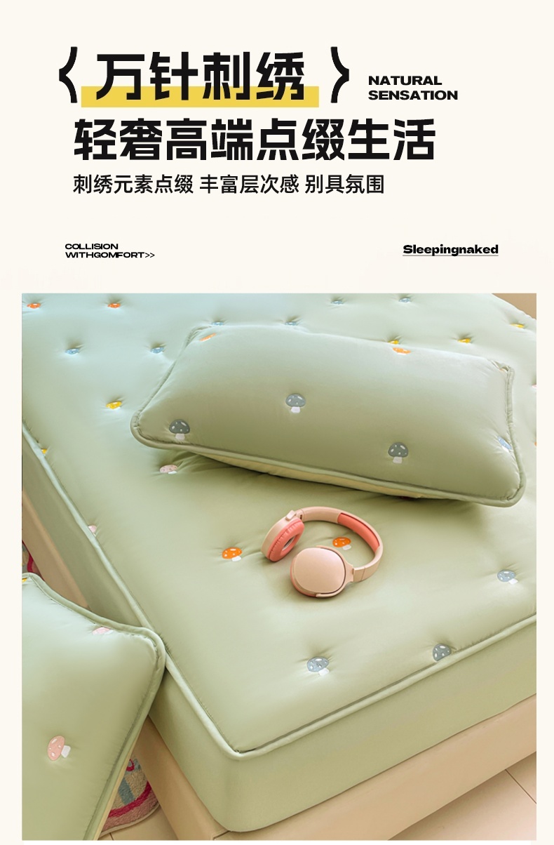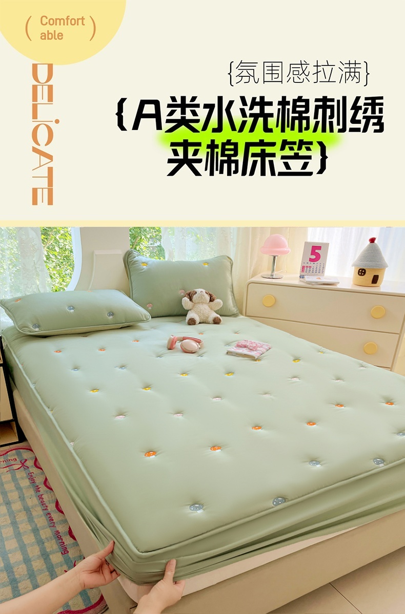 • 91家纺网 家纺一手货源 找家纺 圣比熊 2025新款水洗棉刺绣夹棉床笠床笠防滑床罩床垫保护套榻榻米宿舍三件套 蘑菇屋-苹果绿