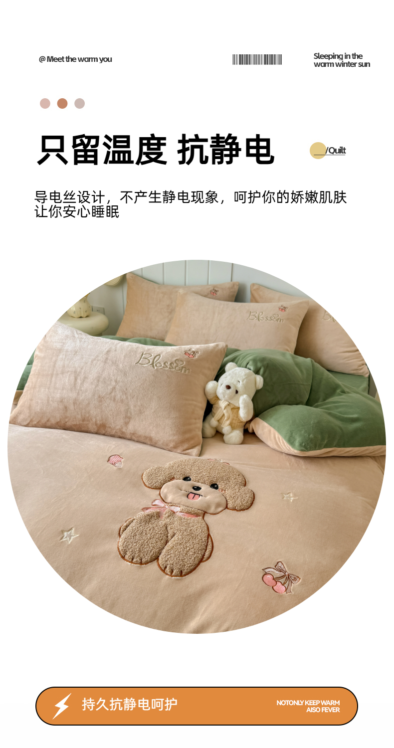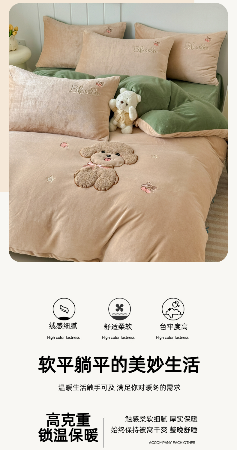 商品名称:莱凯家纺 2025新款贴布绣牛奶绒四件套 开心狗(卡其+绿)