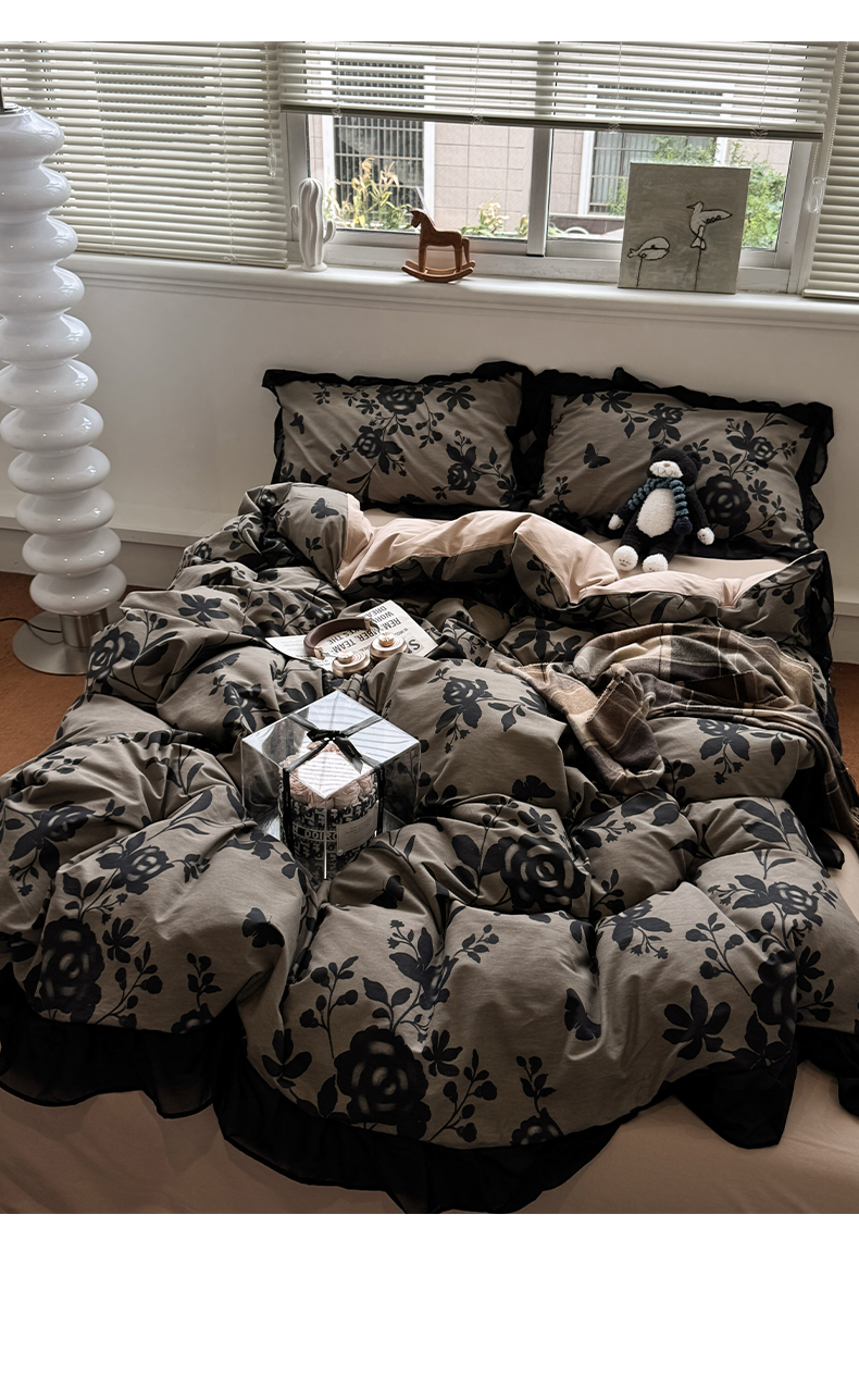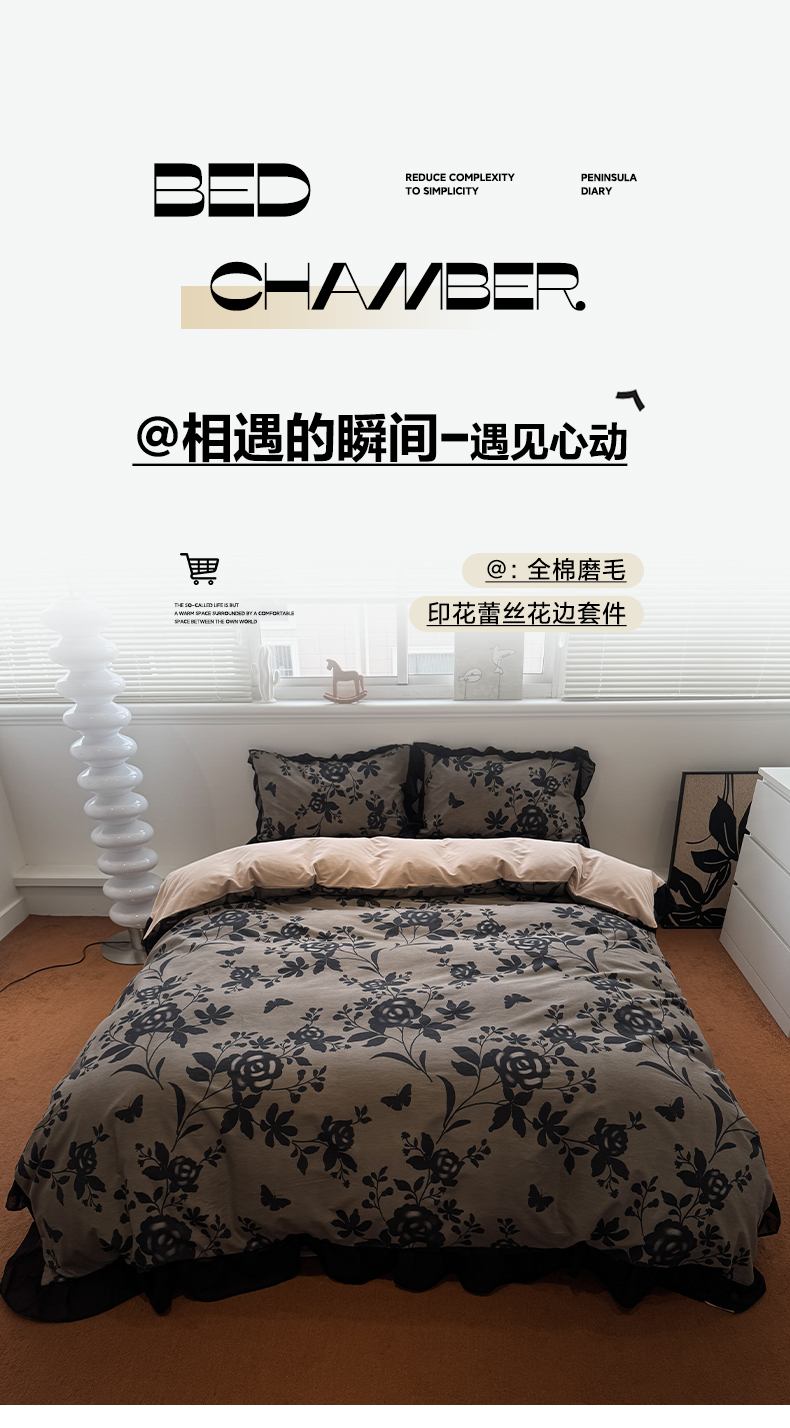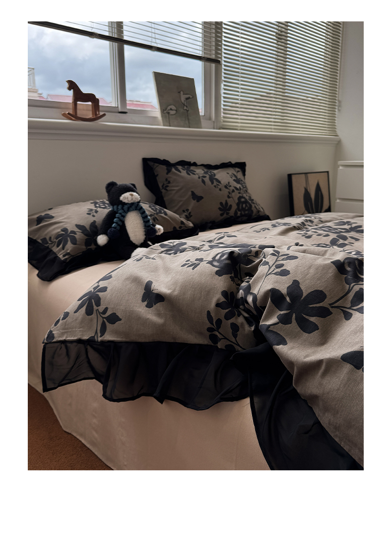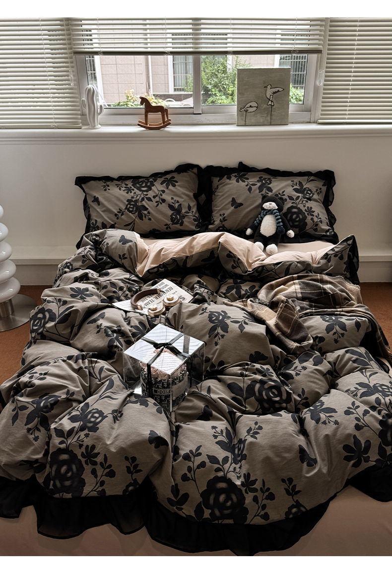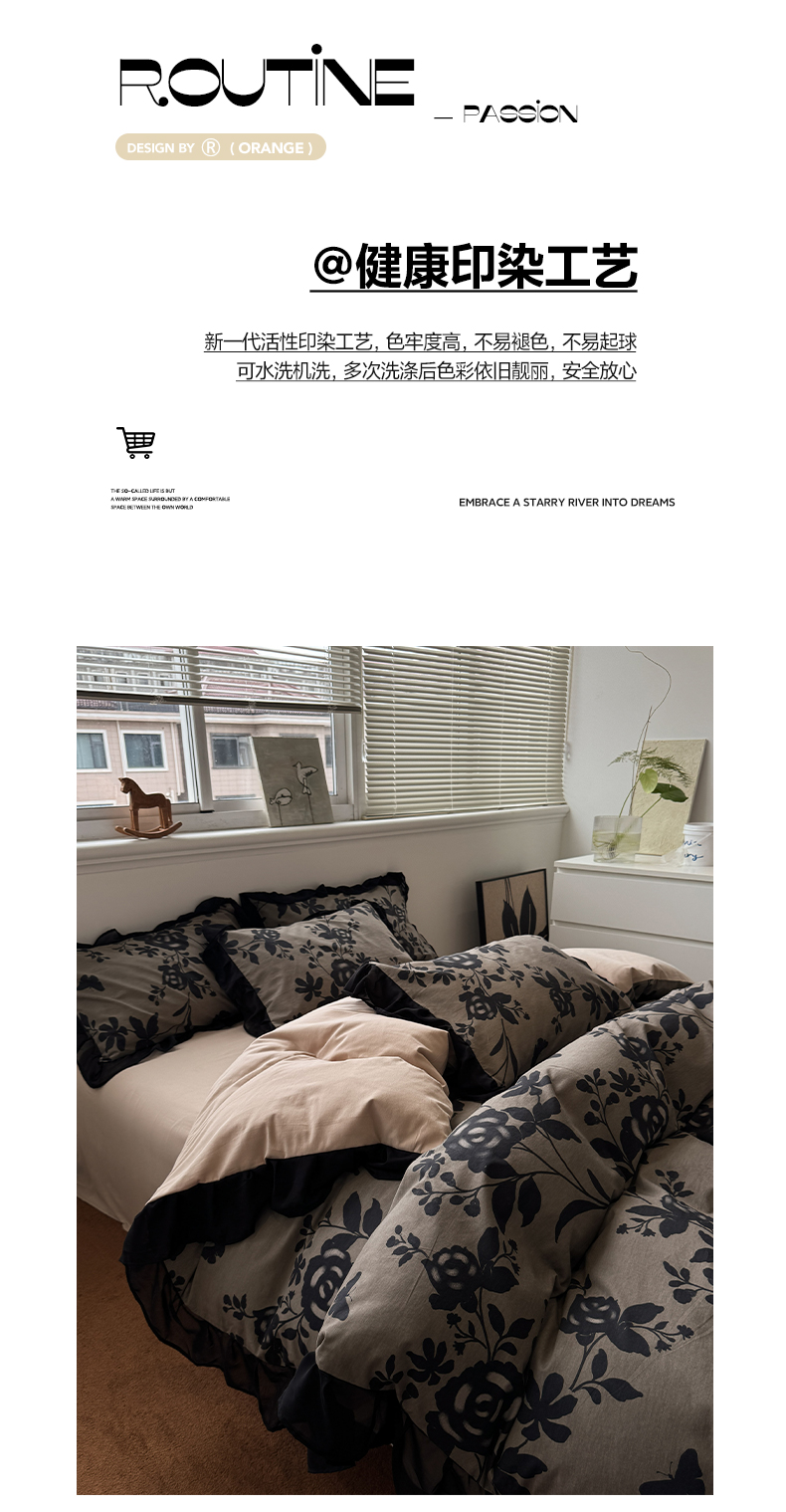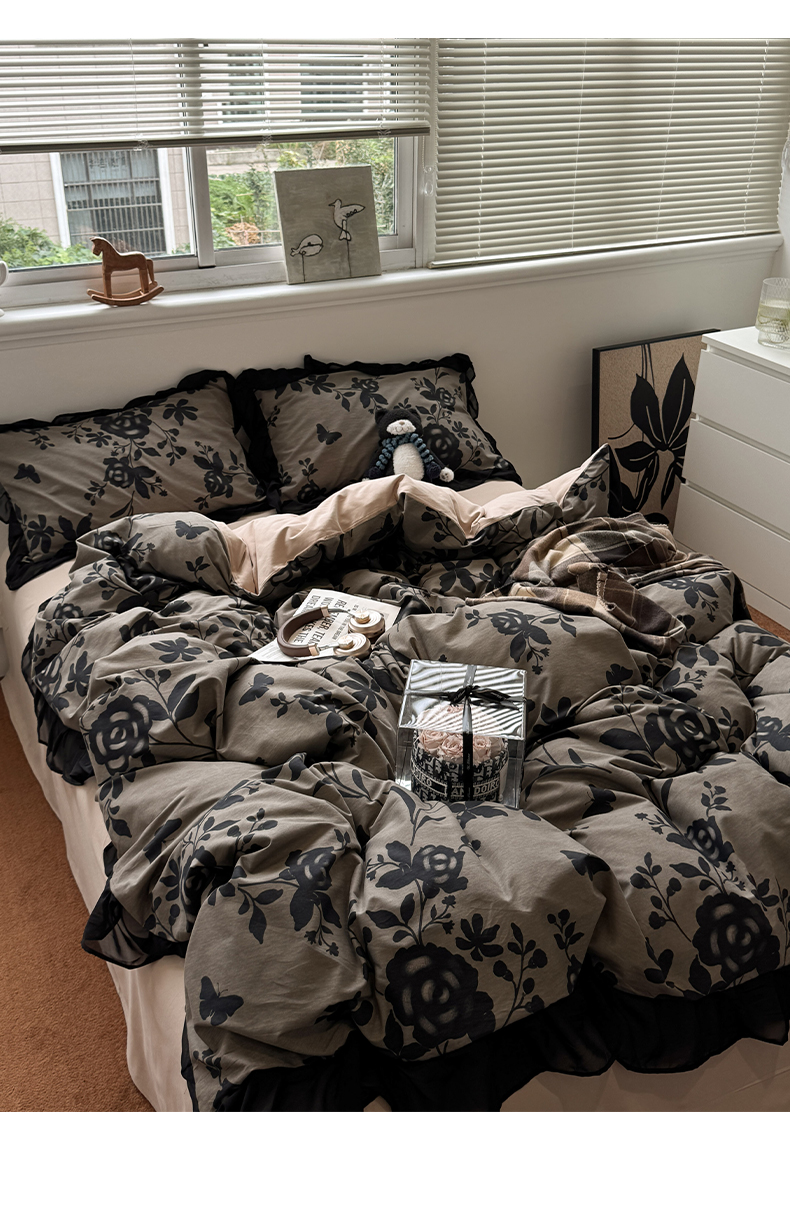 当前位置: 91家纺网 > 商品网购 > 床品套件 > 四件套 > 全棉普通四件套 > 雅居纺家纺 2025新款全棉纯棉赫本风磨毛蕾丝花边四件套-风格二 水墨玫瑰