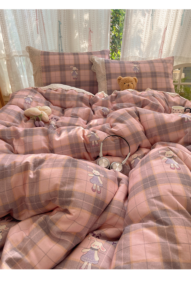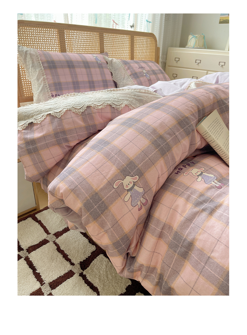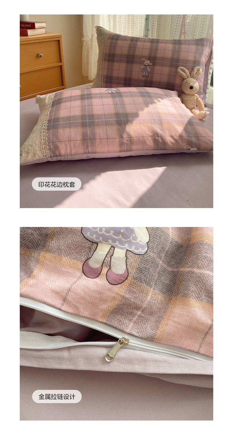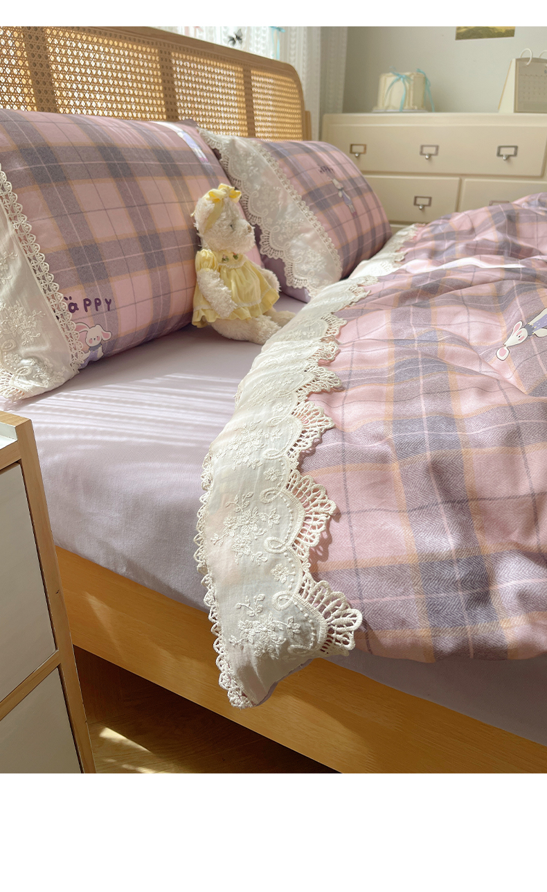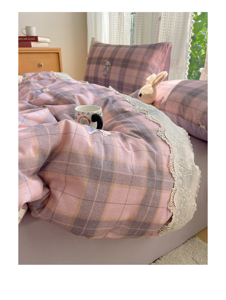 当前位置: 91家纺网 > 商品网购 > 床品套件 > 四件套 > 全棉普通四件套 > 雅居纺家纺 2025新款全棉纯棉韩版花边磨毛四件套 花边紫色小兔子