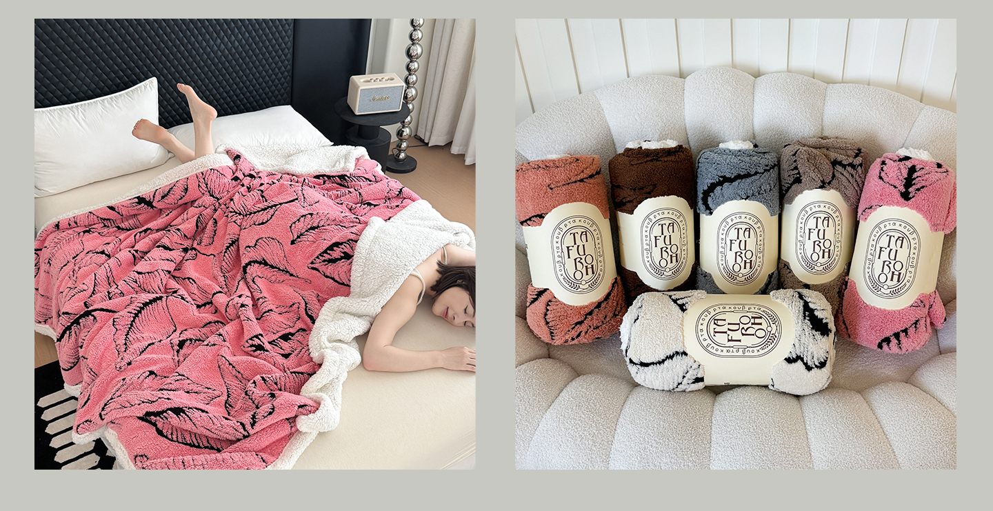 丹本家纺 2025新款双层阳离子叶子提花塔芙绒羊羔绒跨境双层毛毯盖毯毯子 叶子粉色
