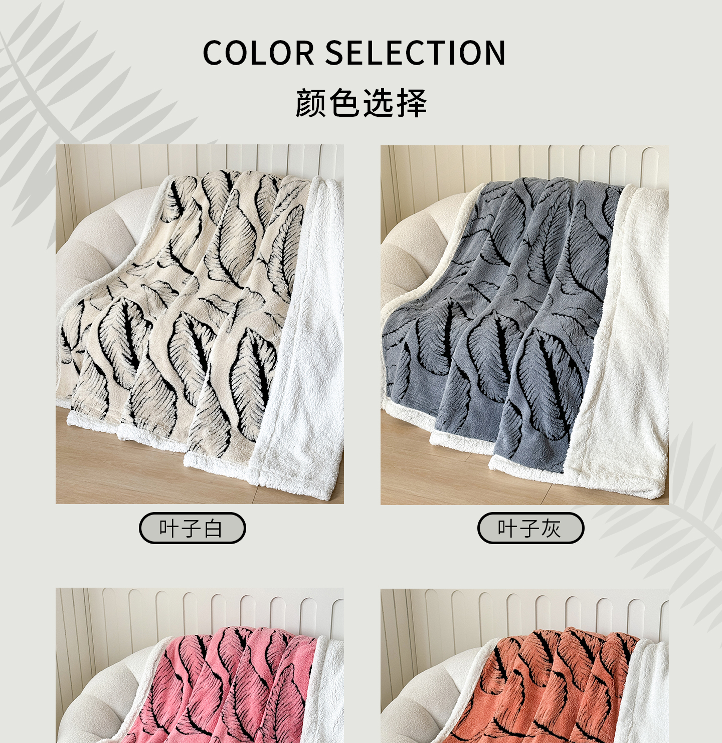 (总)丹本家纺 2025新款双层阳离子叶子提花塔芙绒羊羔绒跨境双层毛毯盖毯毯子,叶子白色,叶子粉色,叶子灰色,叶子橘色,叶子咖色,叶子驼色