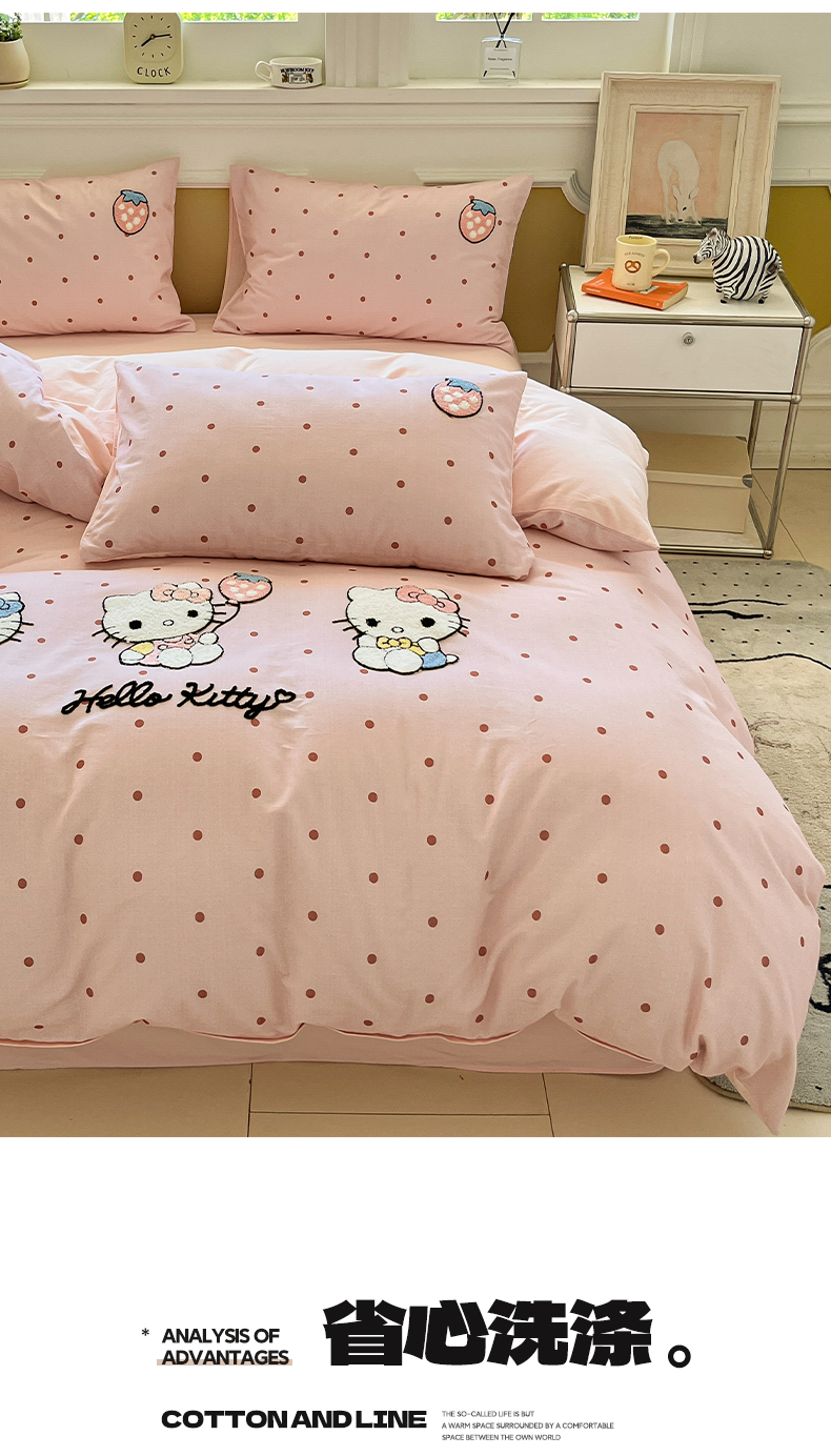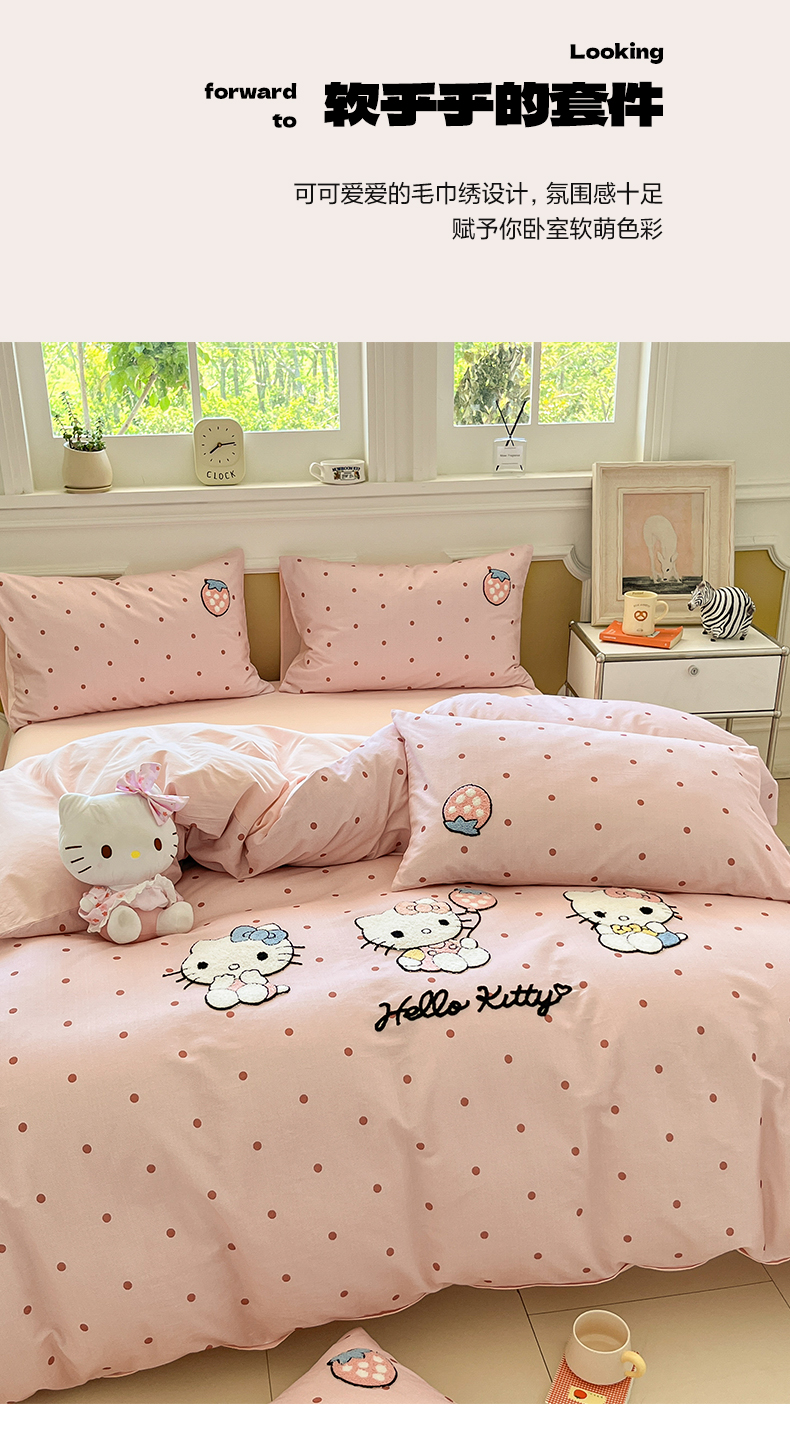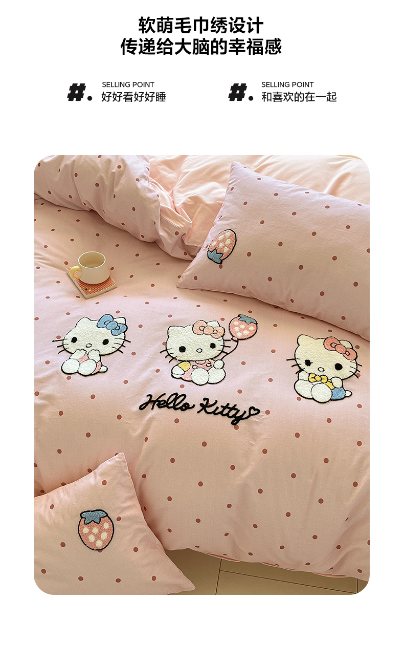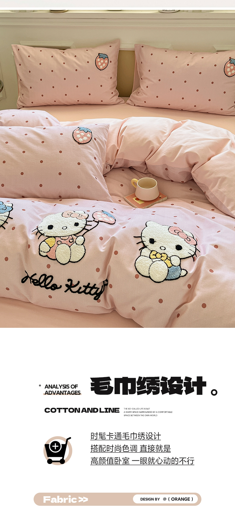当前位置: 91家纺网 > 商品网购 > 床品套件 > 四件套 > 全棉普通四件套 > 雅居纺家纺 2025新款全棉纯棉磨毛三丽鸥毛巾绣四件套 波点KT猫