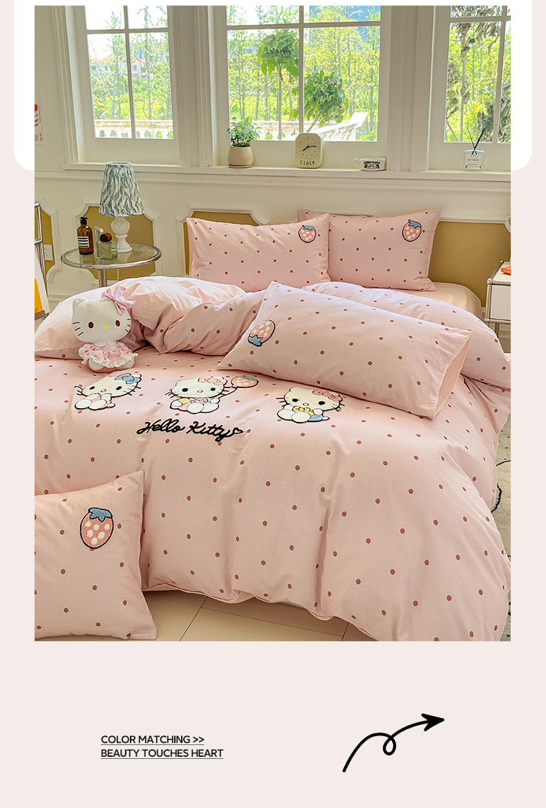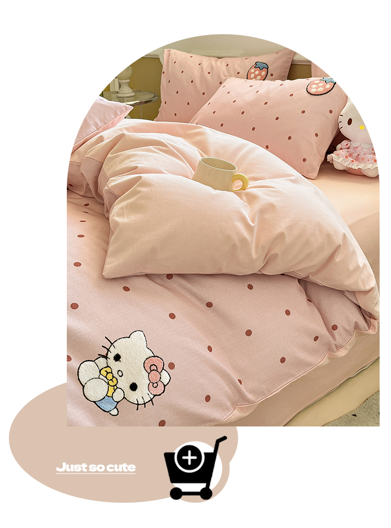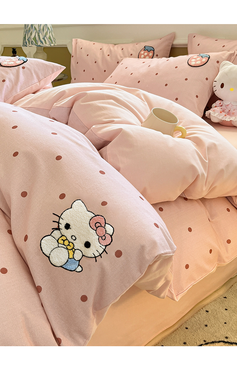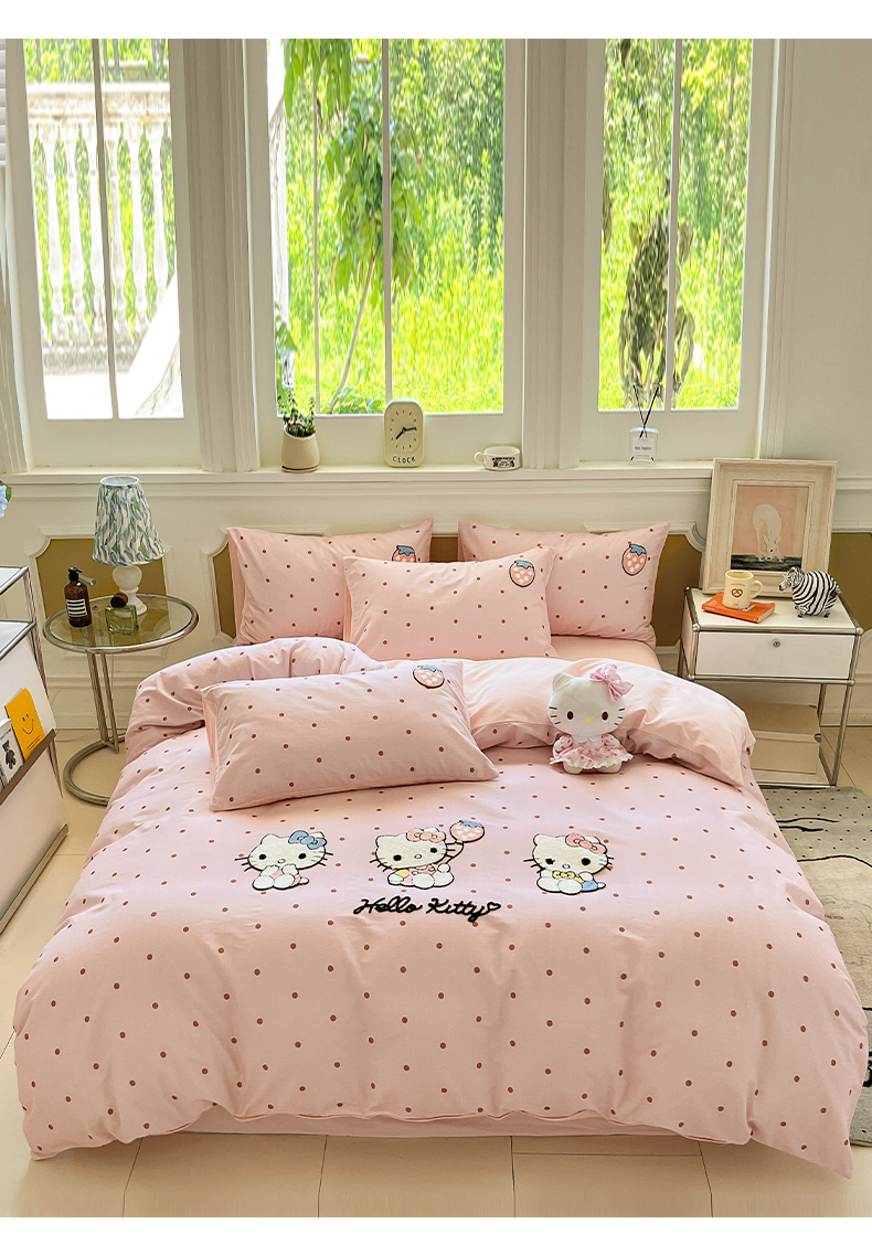 当前位置: 91家纺网 > 商品网购 > 床品套件 > 四件套 > 全棉普通四件套 > 雅居纺家纺 2025新款全棉纯棉磨毛三丽鸥毛巾绣四件套 波点KT猫