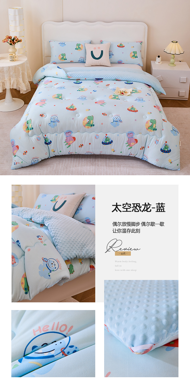 • 91家纺网 家纺一手货源 找家纺 天瑜家纺 2025新款针织棉豆豆绒大豆被冬被被子被芯 太空恐龙蓝