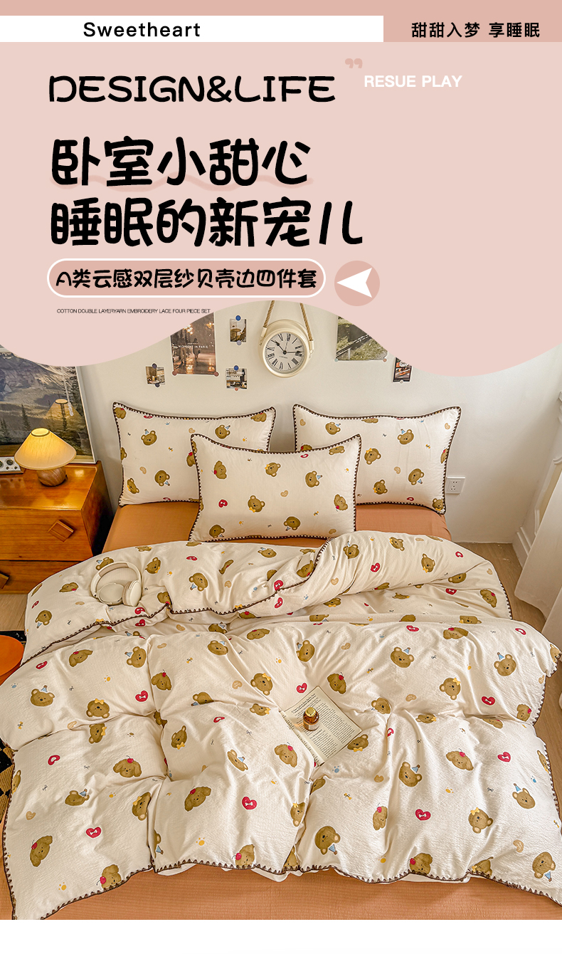 商品名称:晚爱家纺(原晚安家居) 2025新款云感双层纱贝壳边三角针工艺卡通小清新小碎花四件套 爱如星辰