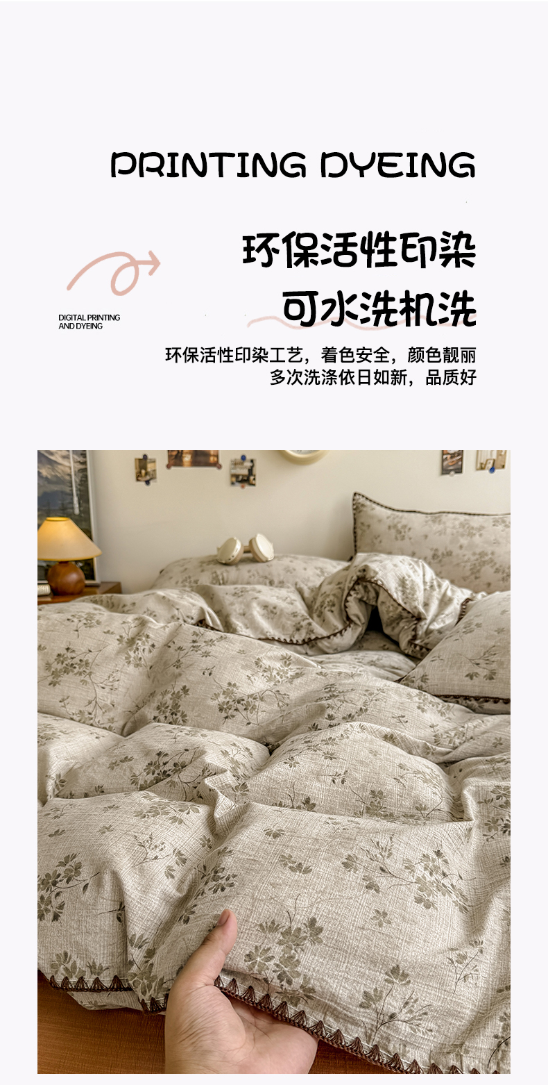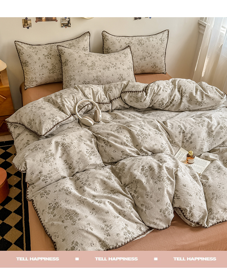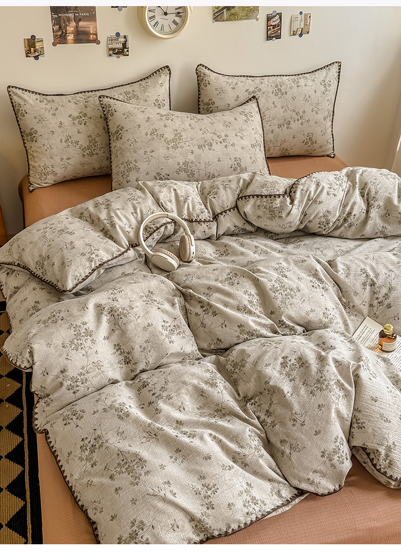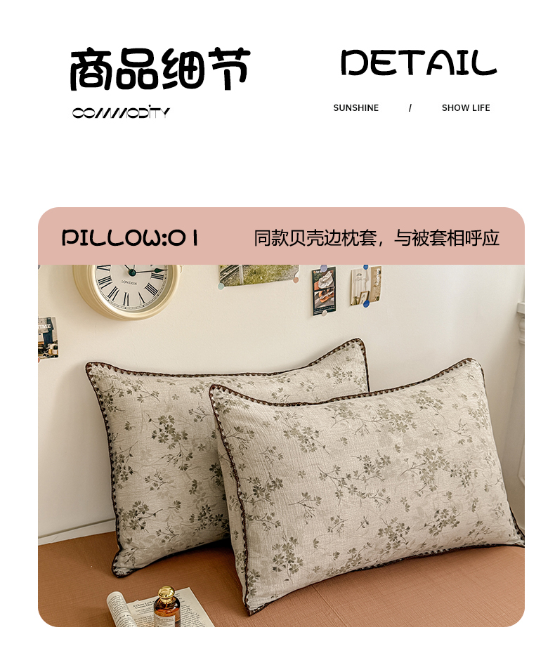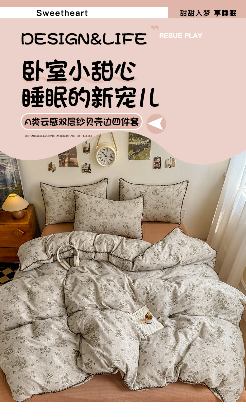 商品名称:晚爱家纺(原晚安家居) 2025新款云感双层纱贝壳边三角针工艺卡通小清新小碎花四件套 倾心咖