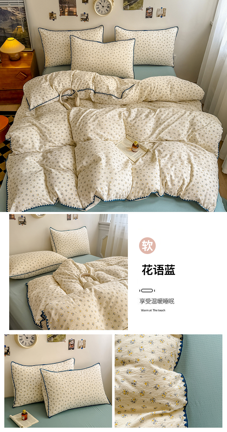 (总)晚爱家纺(原晚安家居) 2025新款云感双层纱贝壳边三角针工艺卡通小清新小碎花四件套,爱如星辰,波点黄,草莓甜心,粉色玫瑰,风铃,海象森林,花语蓝,兰亭序,蓝色蝴蝶结,玫瑰情书,奇妙小熊,倾心咖,小爱心,紫菊梗,紫色小兔