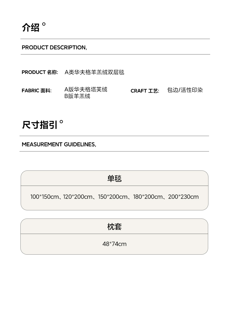 [{"sp_id":11,"sp_name":"\u989c\u8272\u5206\u7c7b","sp_format":2,"sp_list":[{"sp_value_id":655,"sp_value_name":"\u534e\u592b\u683c-\u7c73\u767d","sp_value_image":{"id":999,"path":"https:\/\/img3.91jf.com\/ghelp\/2025\/20250816\/20250816143955_153164.jpeg"},"sp_value_video":{"id":0,"img":"","path":"","time":0,"download_num":0,"play_num":0},"price":"25.00","storage":2500,"weight":"1.000","is_check_weight":0,"plus_price":"","sp_sort":7}]},{"sp_id":12,"sp_name":"\u5c3a\u5bf8","sp_format":1,"sp_list":[{"sp_value_id":75,"sp_value_name":"100x150cm","sp_value_image":{"id":0,"path":""},"sp_value_video":{"id":0,"img":"","path":"","time":0,"download_num":0,"play_num":0},"price":"25.00","storage":500,"weight":"1.000","is_check_weight":0,"plus_price":"","sp_sort":5},{"sp_value_id":76,"sp_value_name":"120x200cm","sp_value_image":{"id":0,"path":""},"sp_value_video":{"id":0,"img":"","path":"","time":0,"download_num":0,"play_num":0},"price":"35.00","storage":500,"weight":"1.200","is_check_weight":0,"plus_price":"","sp_sort":6},{"sp_value_id":77,"sp_value_name":"150x200cm","sp_value_image":{"id":0,"path":""},"sp_value_video":{"id":0,"img":"","path":"","time":0,"download_num":0,"play_num":0},"price":"40.00","storage":500,"weight":"1.500","is_check_weight":0,"plus_price":"","sp_sort":7},{"sp_value_id":78,"sp_value_name":"180x200cm","sp_value_image":{"id":0,"path":""},"sp_value_video":{"id":0,"img":"","path":"","time":0,"download_num":0,"play_num":0},"price":"45.00","storage":500,"weight":"1.800","is_check_weight":0,"plus_price":"","sp_sort":8},{"sp_value_id":767,"sp_value_name":"200x230cm","sp_value_image":{"id":0,"path":""},"sp_value_video":{"id":0,"img":"","path":"","time":0,"download_num":0,"play_num":0},"price":"50.00","storage":500,"weight":"2.000","is_check_weight":0,"plus_price":"","sp_sort":9}]}]