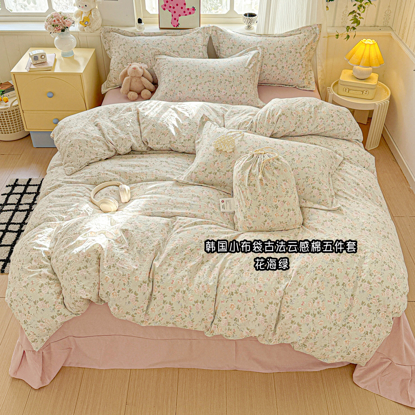 商品名称:梦莱斯 2025新款韩国小布袋古法云感棉四件套 花海绿