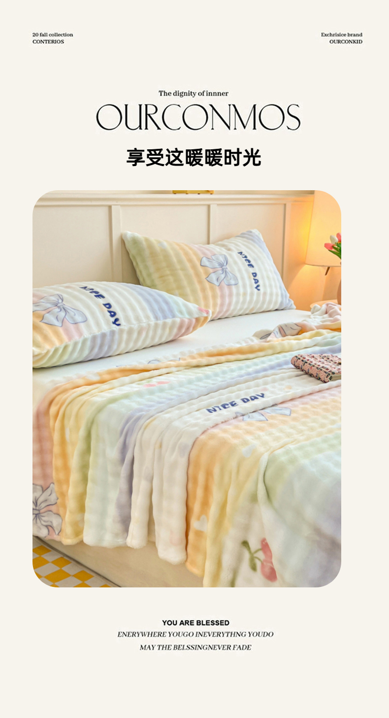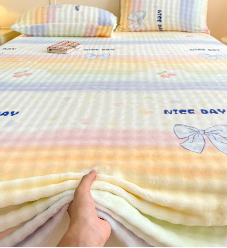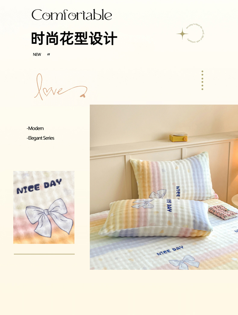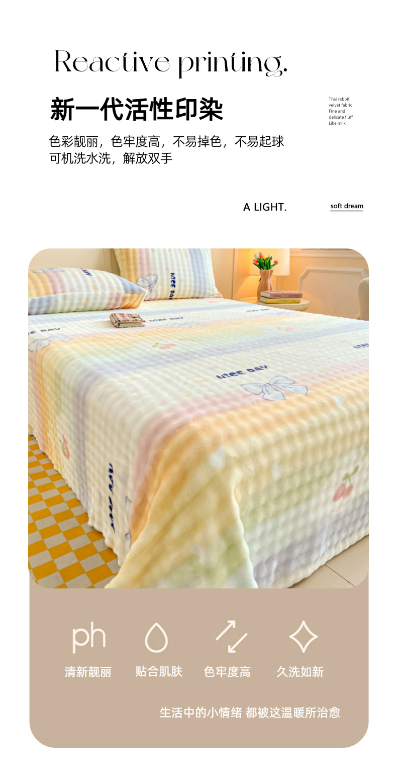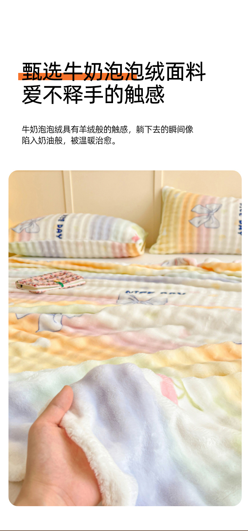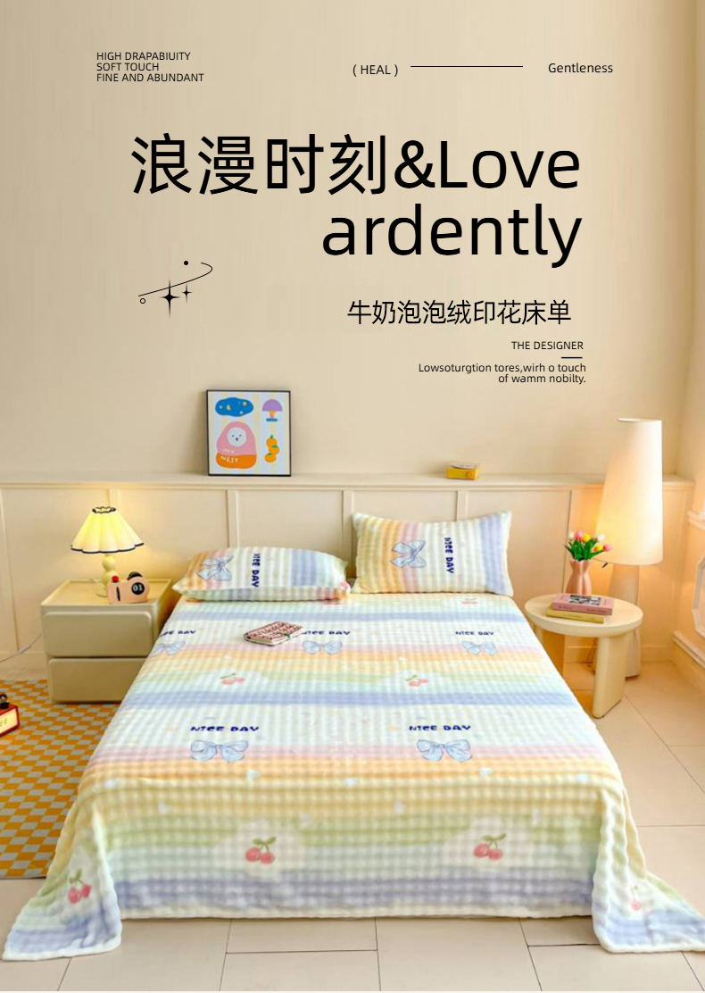• 91家纺网 家纺一手货源 找家纺 爱屋及屋 2025新款牛奶泡泡绒印花单床单 床单单件 彩虹蝴蝶结