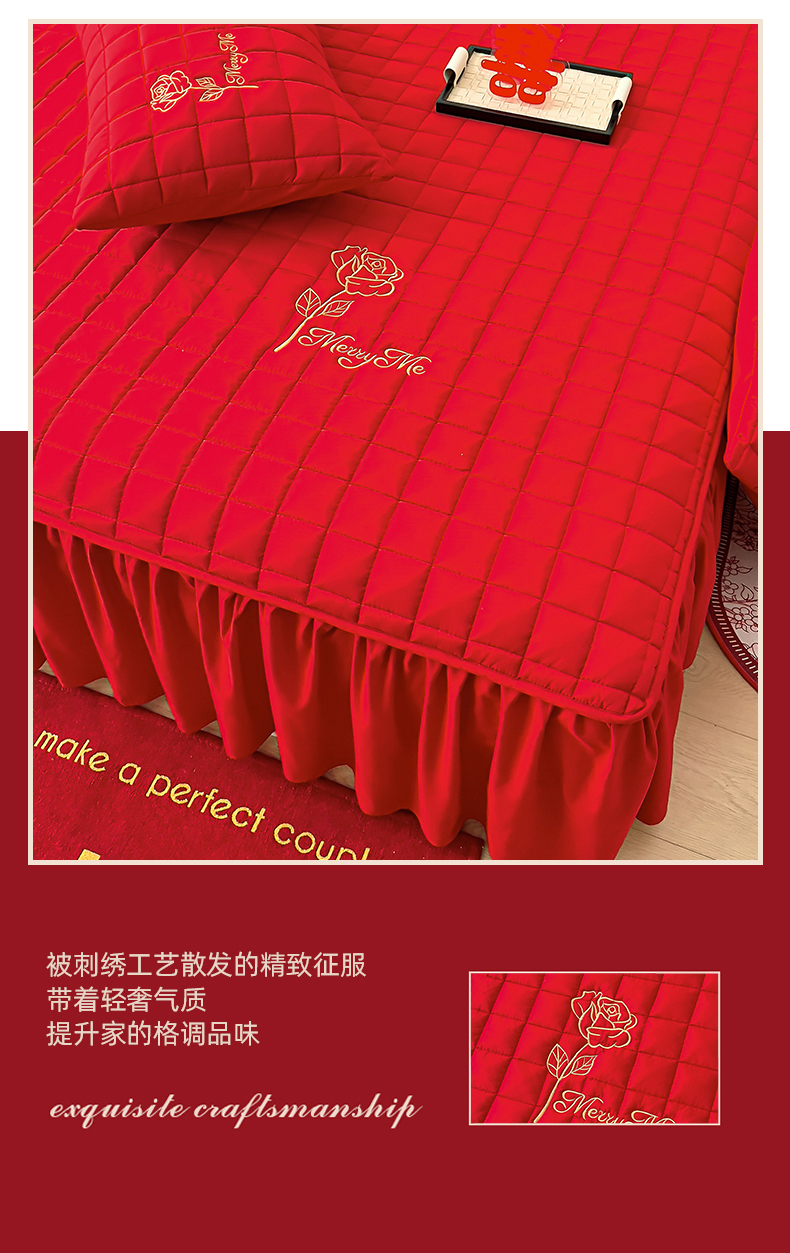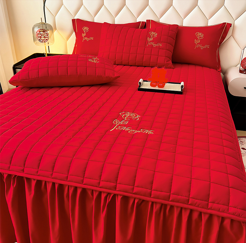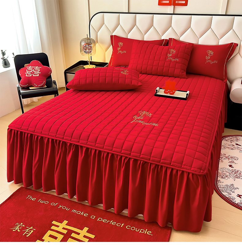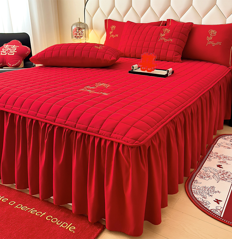 七仙女家纺 2025新款轻奢婚庆高克重水洗磨毛夹棉床裙单床裙床裙单件床裙三件套 花开并蒂