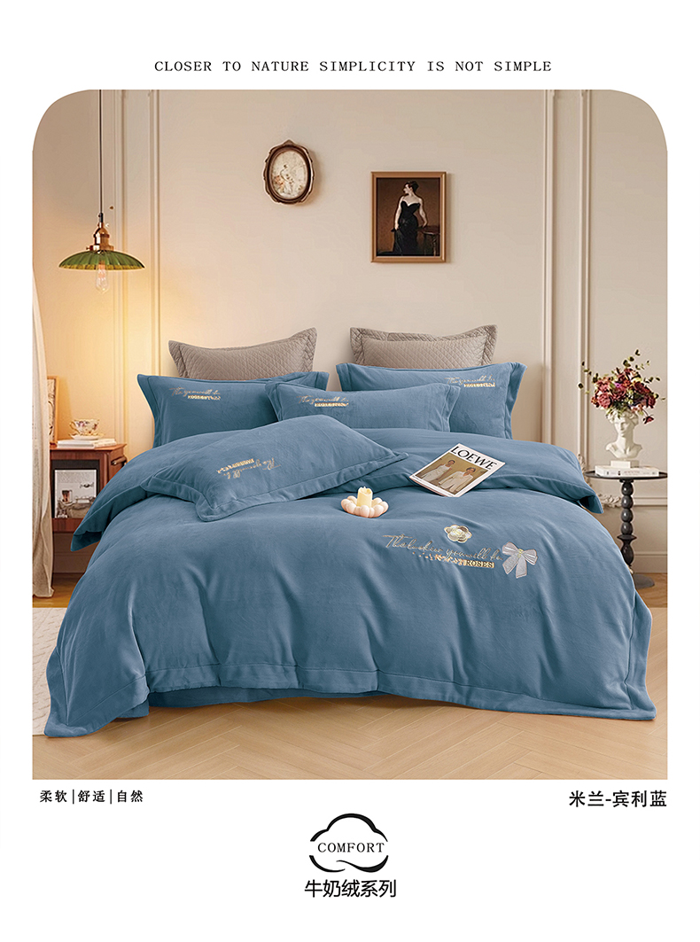 绒博士 2025新款270克全消光牛奶绒刺绣宽边款四件套--米兰系列 米兰-宾利蓝
