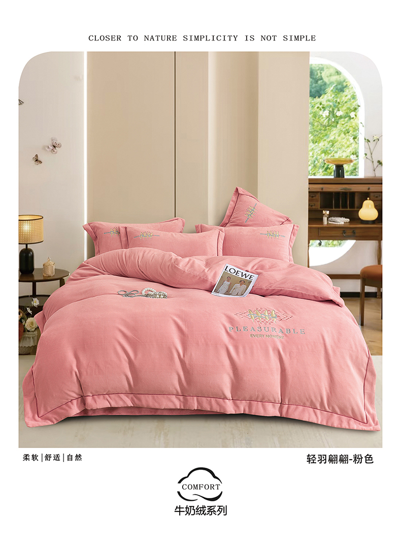 (总)绒博士 2025新款270克牛奶绒双拼角刺绣宽边款四件套--维也纳系列,维也纳-粉豆沙,维也纳-果绿,维也纳-浅咖,维也纳-浅蓝