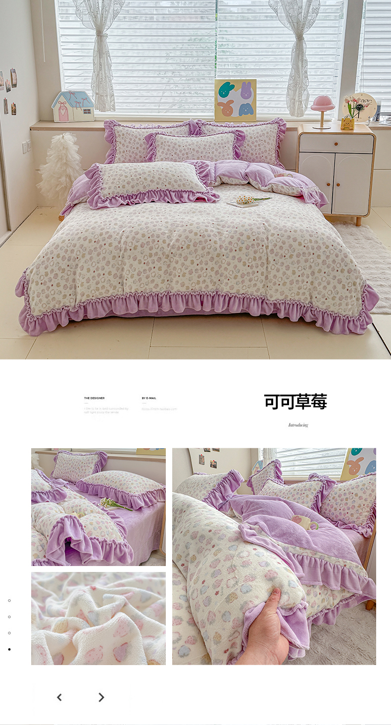 商品名称:橘子家 2025轻奢法式花边公主风婴儿绒牛奶绒高克重四件套 可可草莓