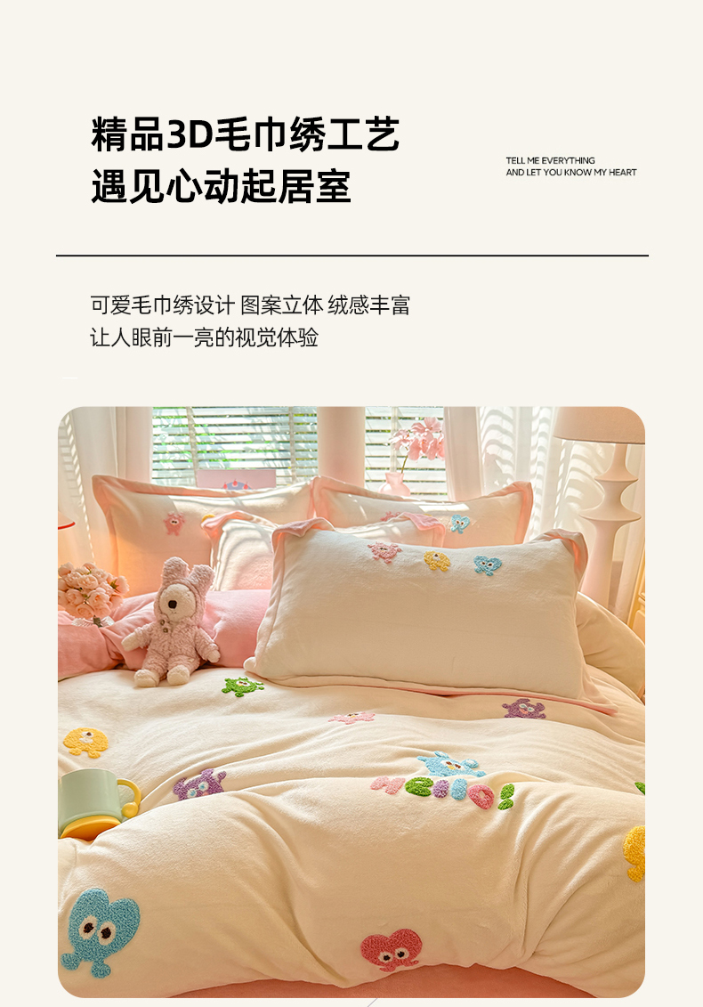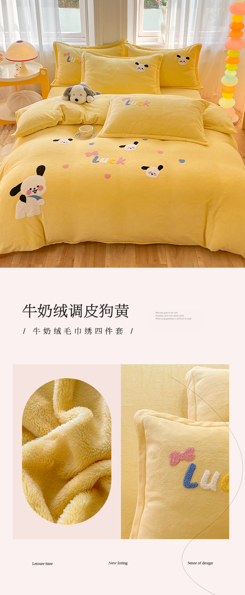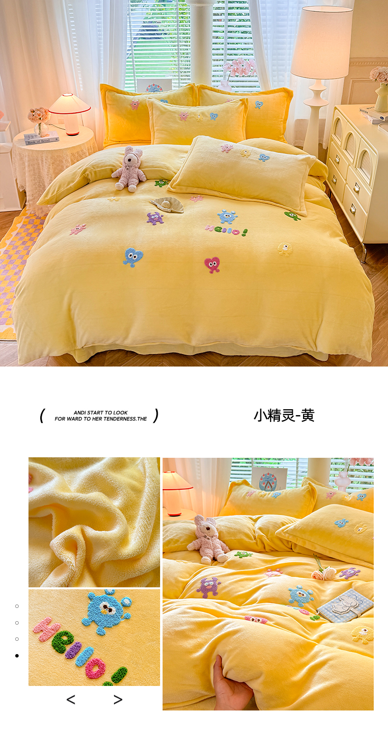 当前位置: 91家纺网 > 商品网购 > 床品套件 > 四件套 > 牛奶绒四件套 > 雨菲家纺 2025新款高克重加厚简约毛巾绣花牛奶绒四件套 牛奶绒小精灵奶黄粉
