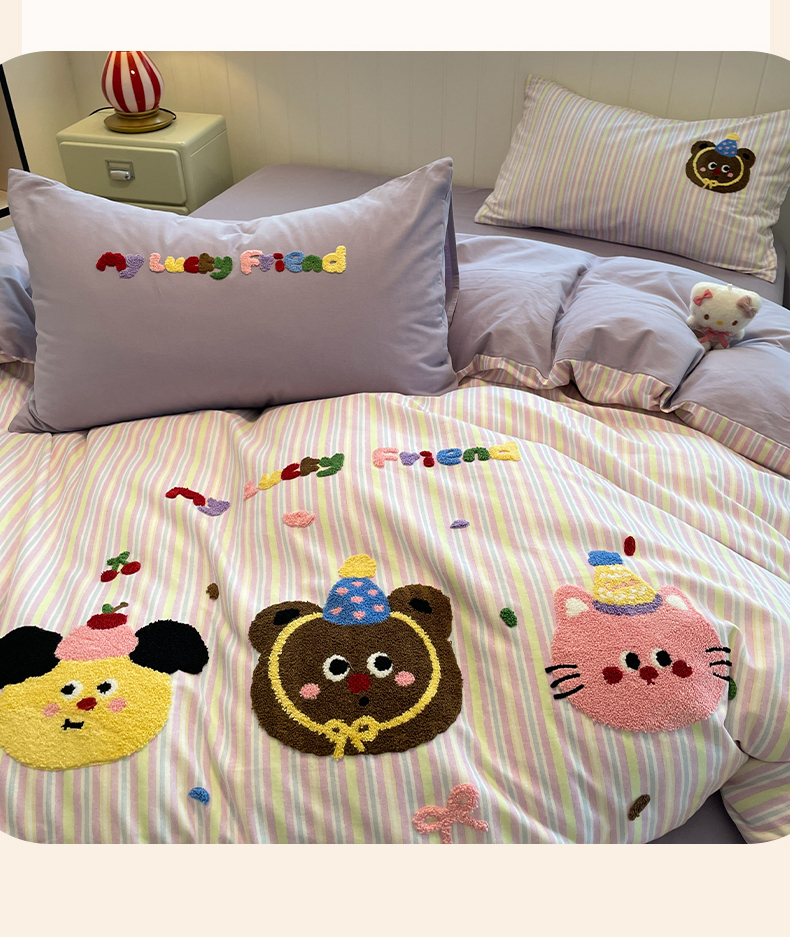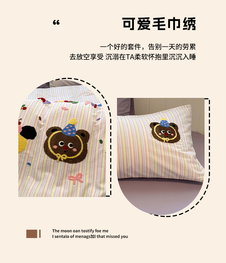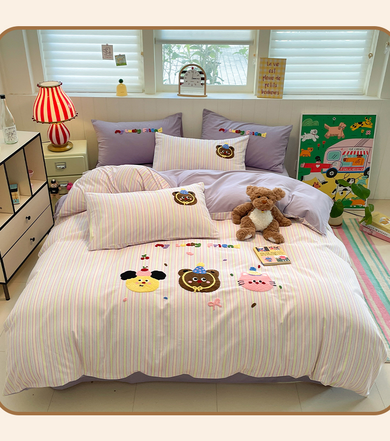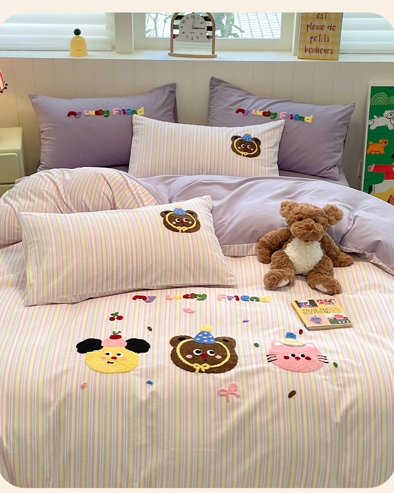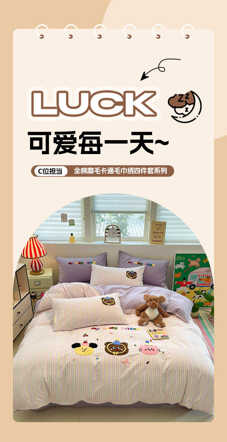 当前位置: 91家纺网 > 商品网购 > 床品套件 > 四件套 > 普通磨毛四件套 > 蓝邻家纺 2025新款全棉磨毛卡通刺绣款四件套--毛巾绣系列 樱桃好朋友
