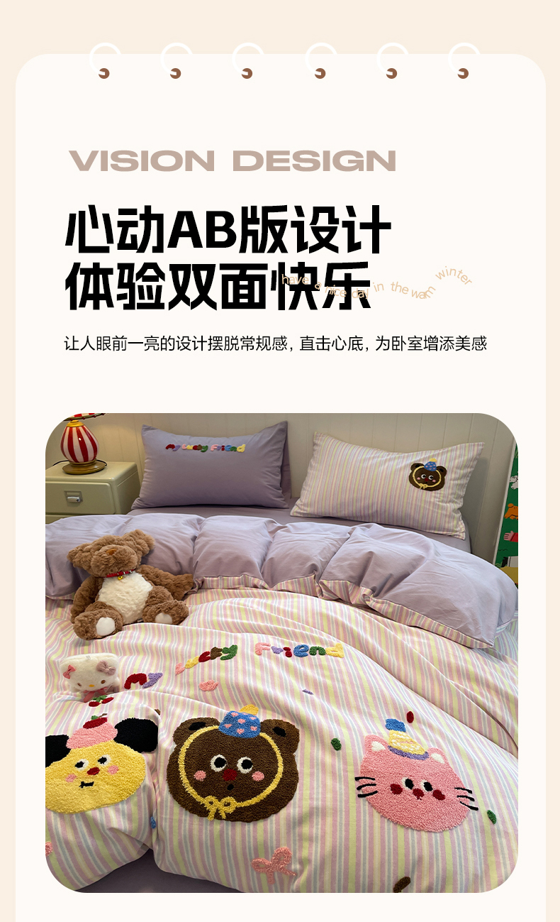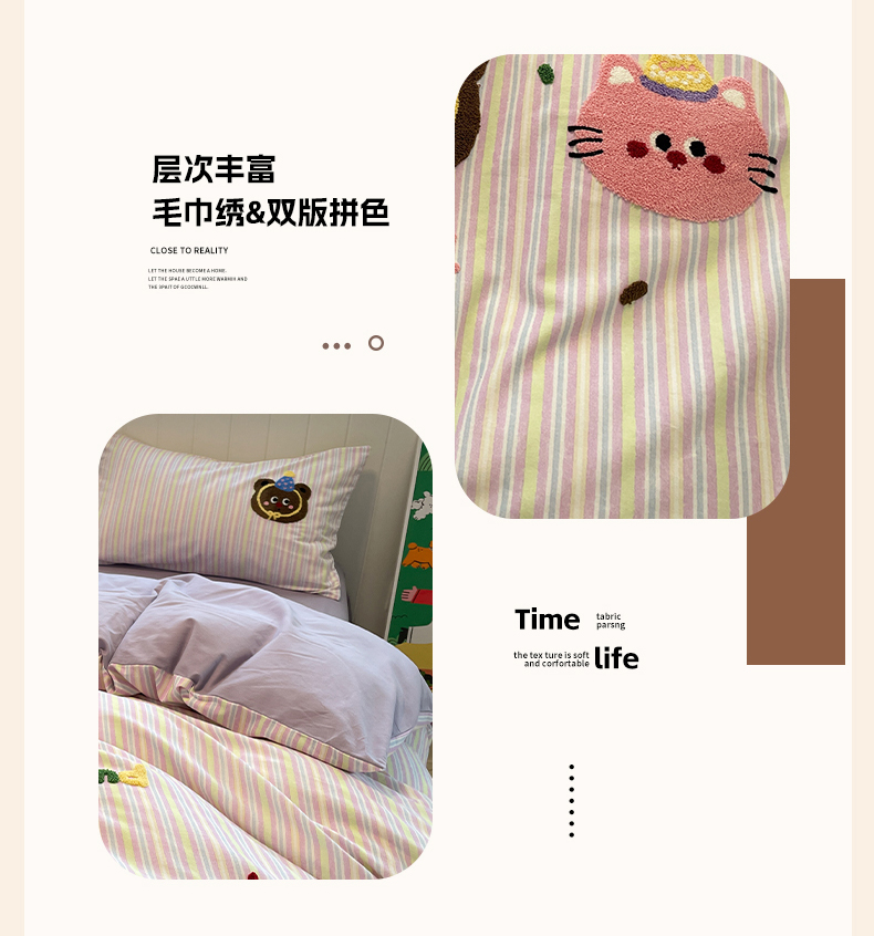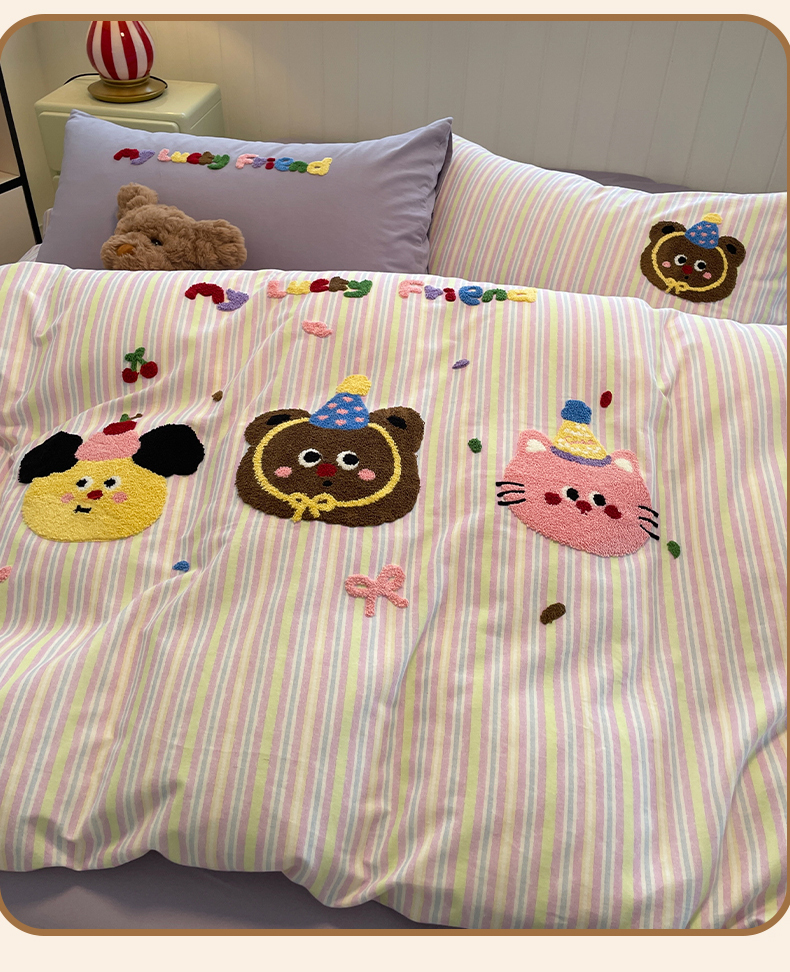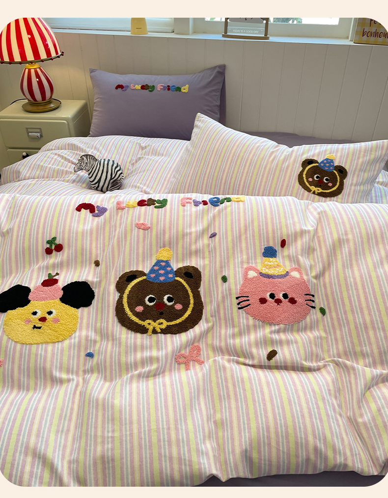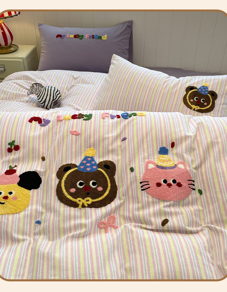 当前位置: 91家纺网 > 商品网购 > 床品套件 > 四件套 > 普通磨毛四件套 > 蓝邻家纺 2025新款全棉磨毛卡通刺绣款四件套--毛巾绣系列 樱桃好朋友