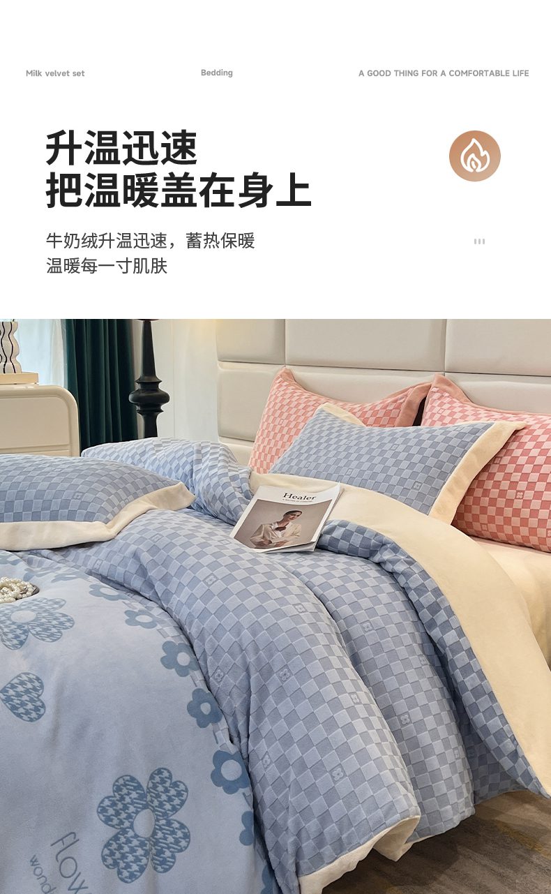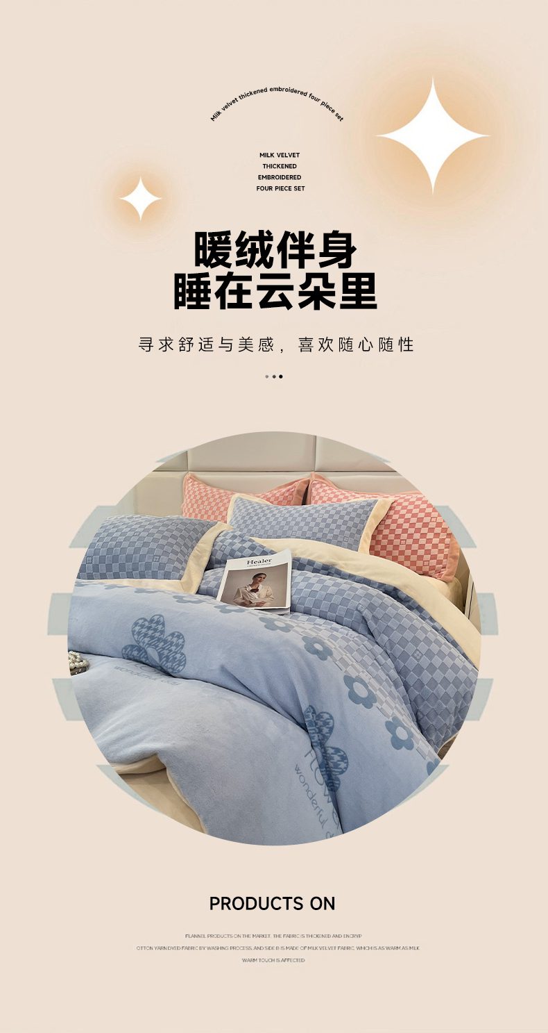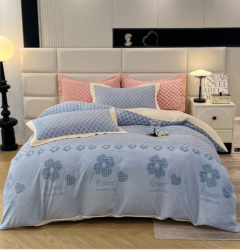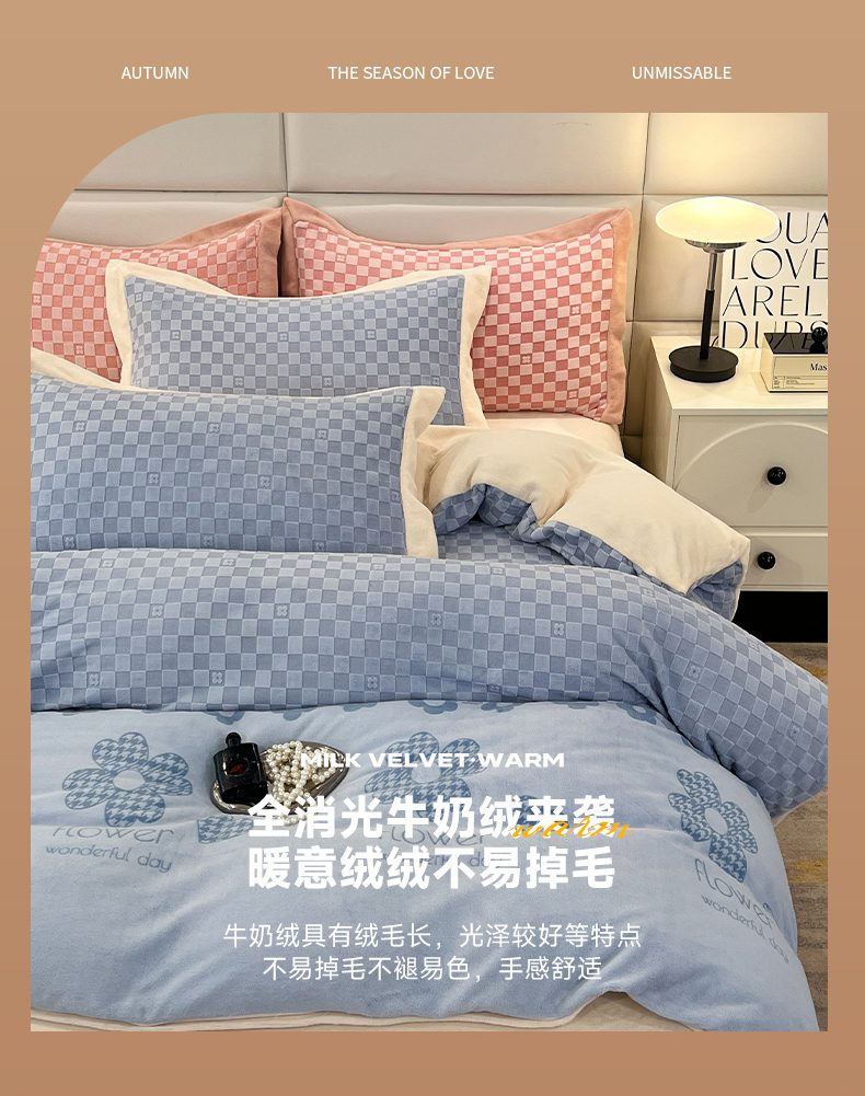 花香四季家纺 2025新款全消光工艺320克牛奶绒四件套 棋盘格-蓝