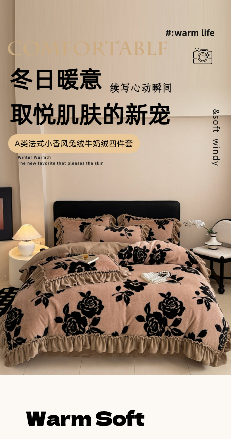 (总)米莱家纺 2023新款兔毛四件套 玫瑰花,玫瑰花-白加咖,玫瑰花-白加粉,玫瑰花-粉色,玫瑰花-灰色,玫瑰花-咖色,玫瑰花-绿色,玫瑰花-紫色