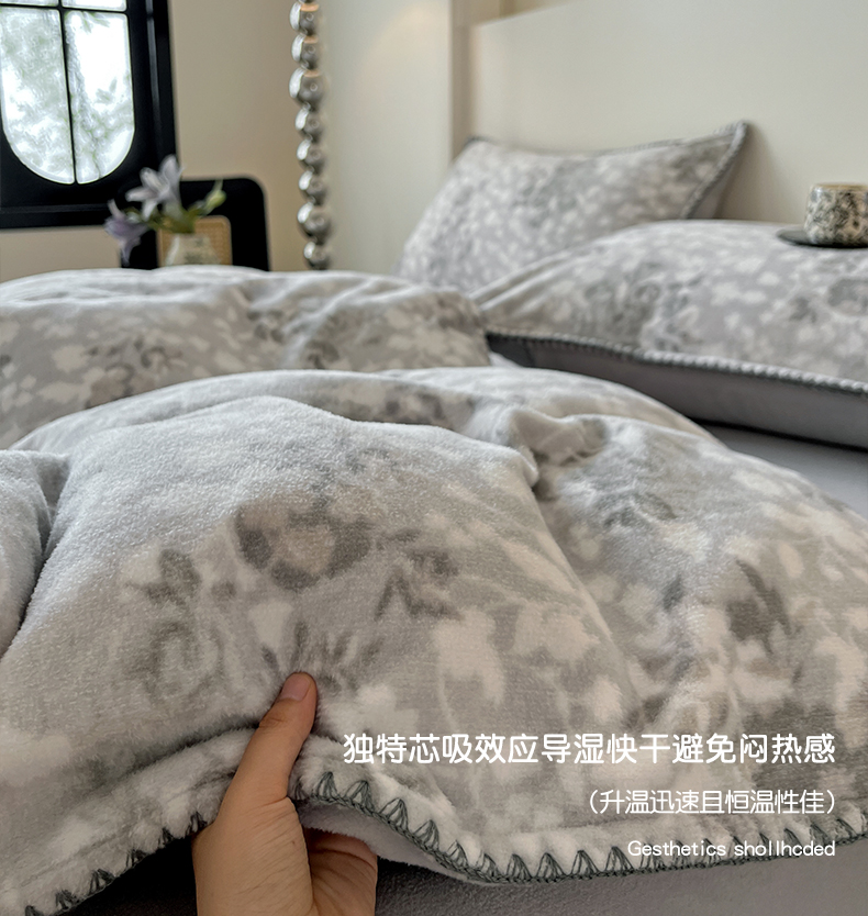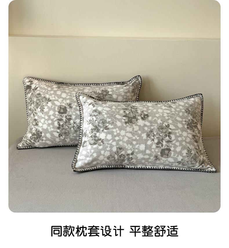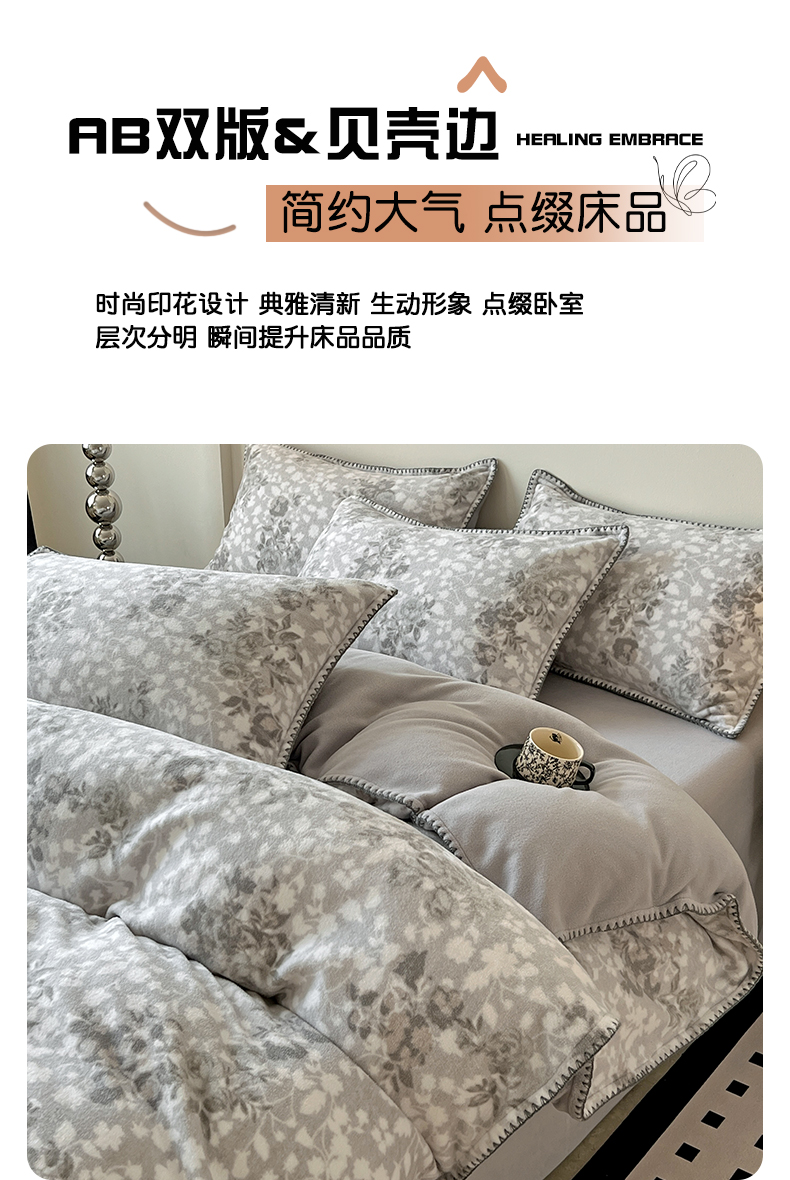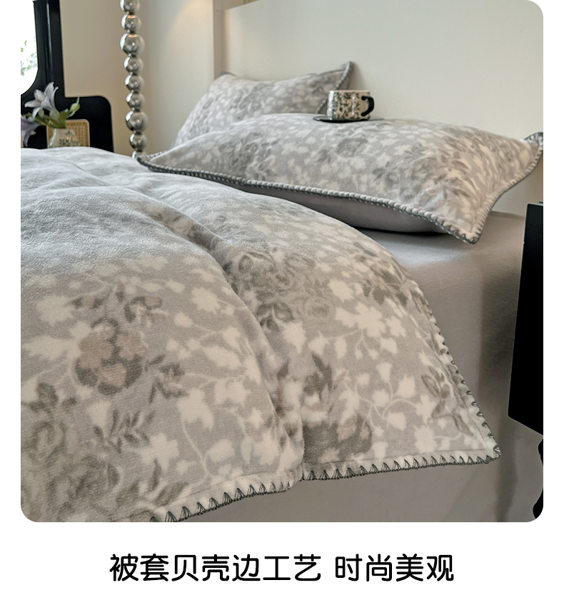 商品名称:忆生活家纺 2025秋冬新品软糯缇肤绒印花贝壳边四件套 卡拉-灰