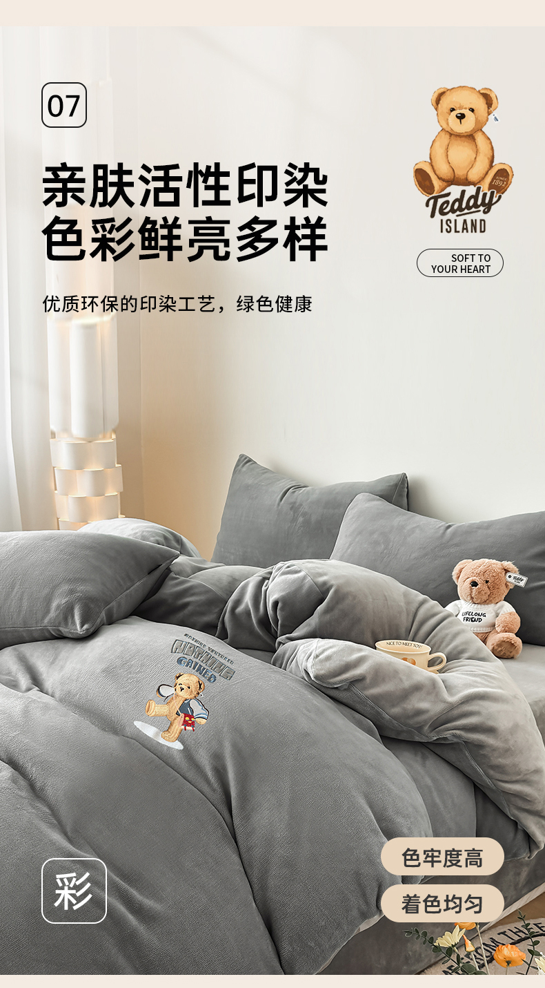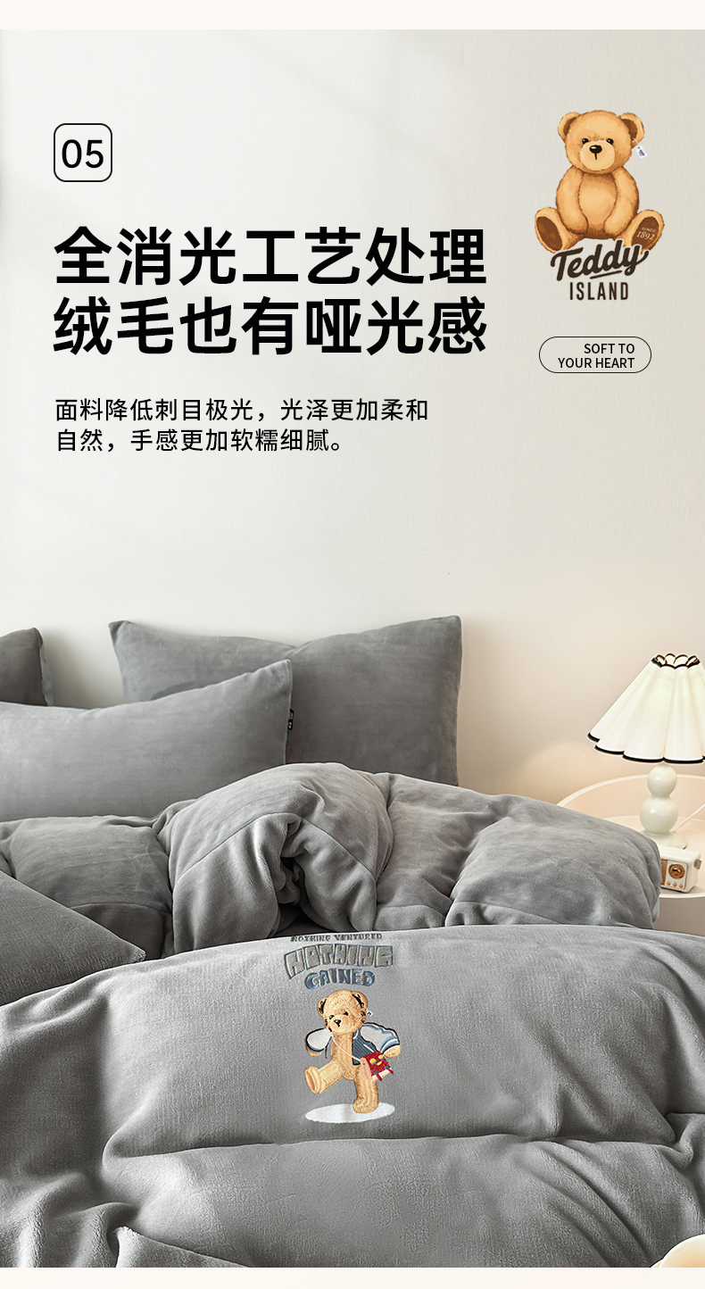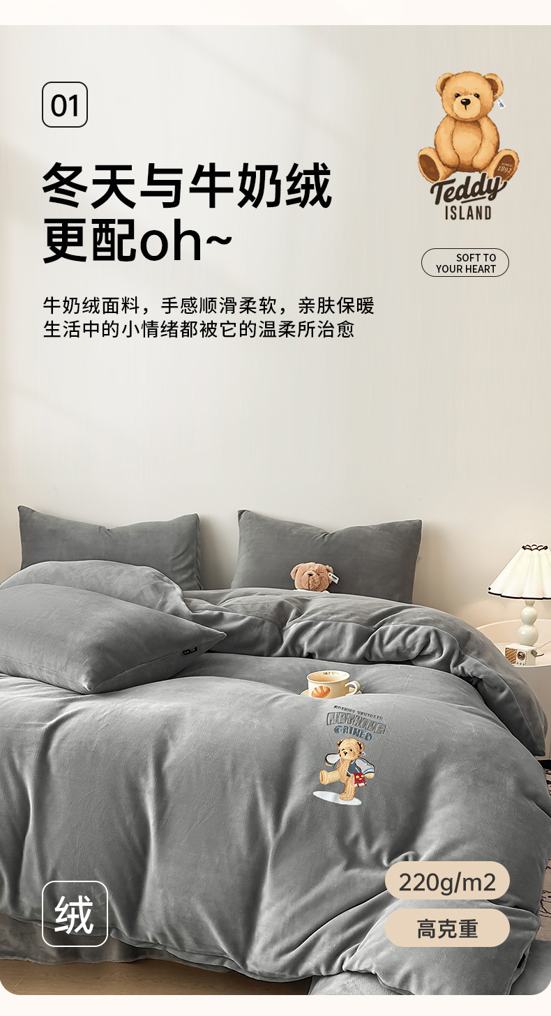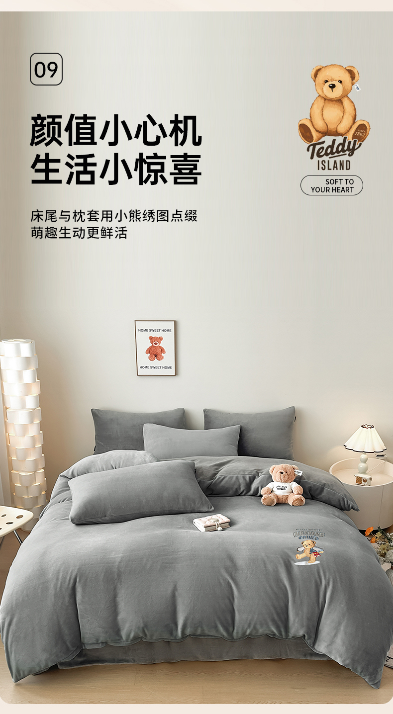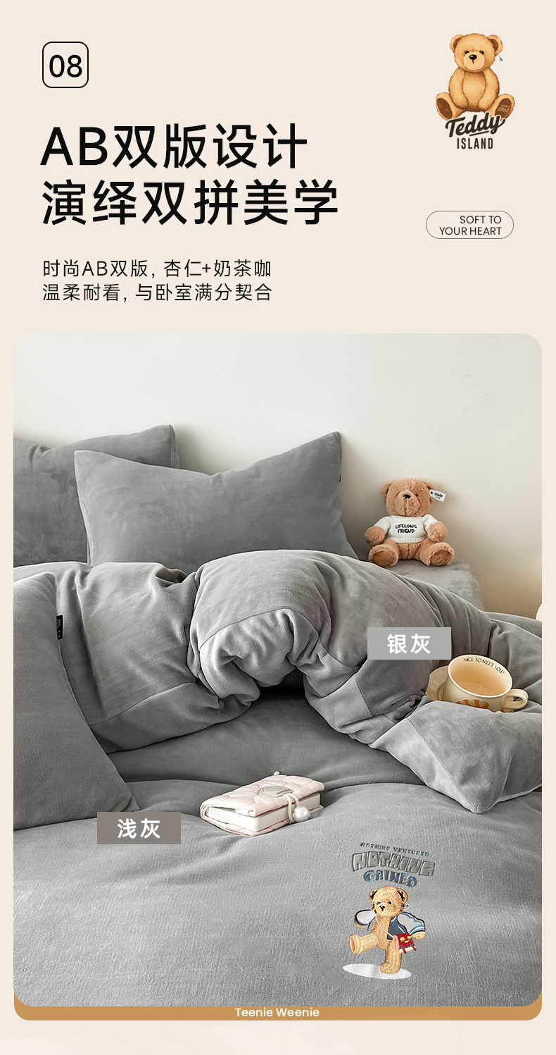 (总)泰迪爱兰Teddy ISLAND 2025新款牛奶绒绣花四件套,粉色+杏仁色,可可色+杏仁色,雾霾灰+神秘灰,香芋紫+神秘灰,杏仁色+可可色,杏仁色+神秘灰