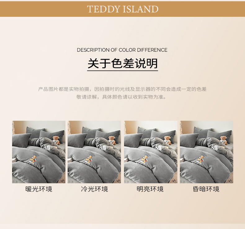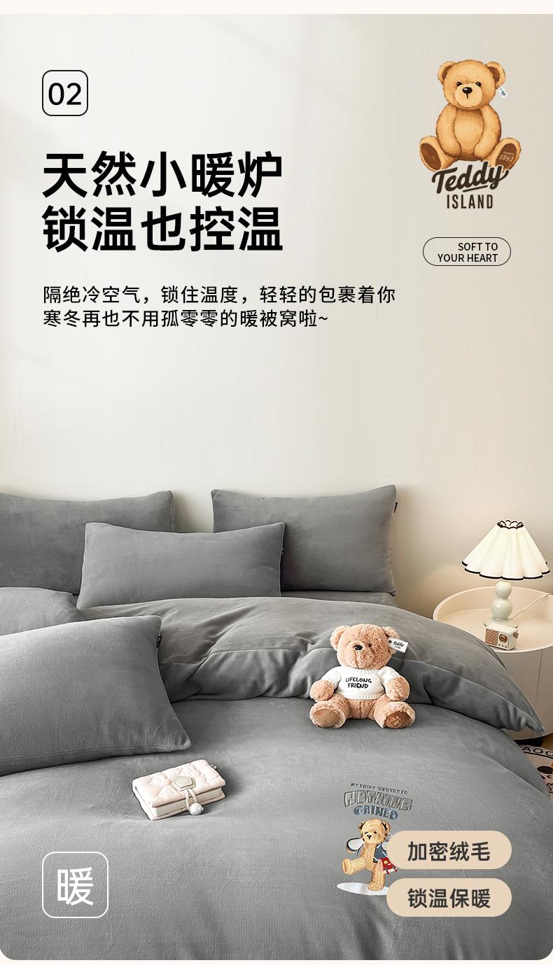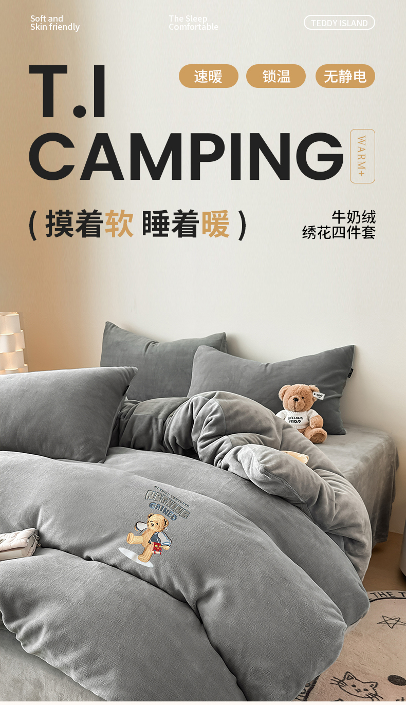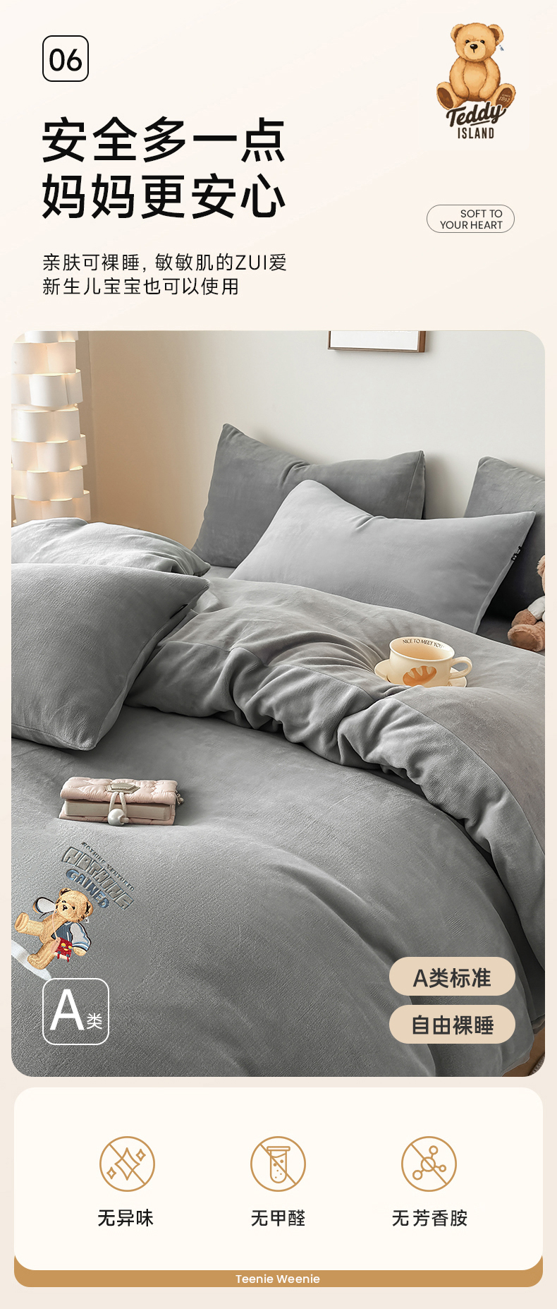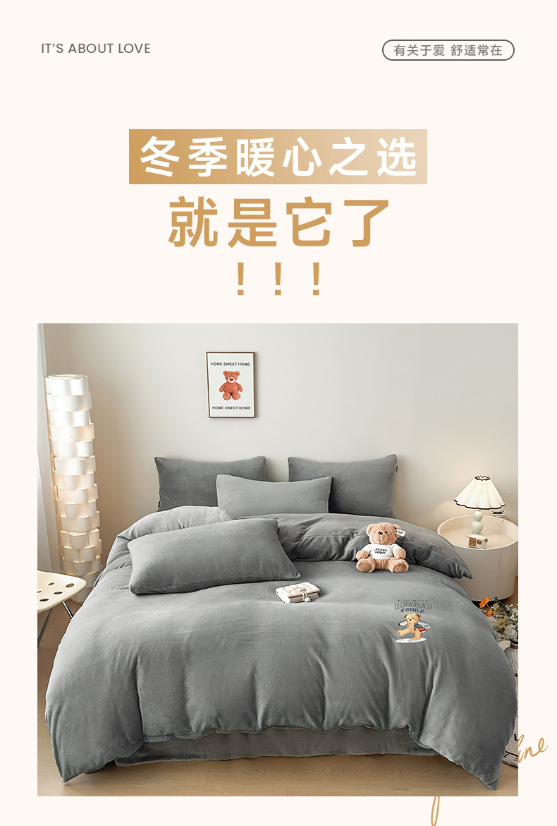 (总)泰迪爱兰Teddy ISLAND 2025新款牛奶绒绣花四件套,粉色+杏仁色,可可色+杏仁色,雾霾灰+神秘灰,香芋紫+神秘灰,杏仁色+可可色,杏仁色+神秘灰