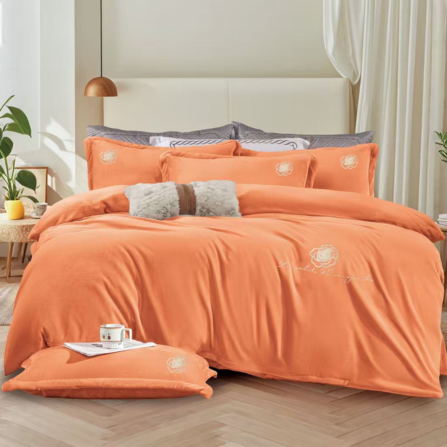 小叮当家纺仓储工厂店 2025新款亲肤舒适加厚刺绣款牛奶绒四件套 橙色