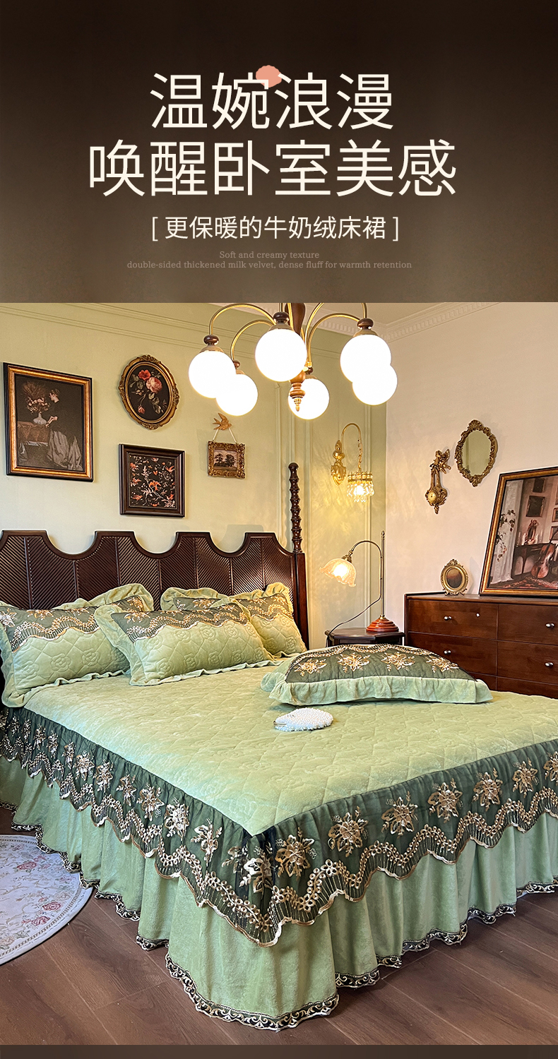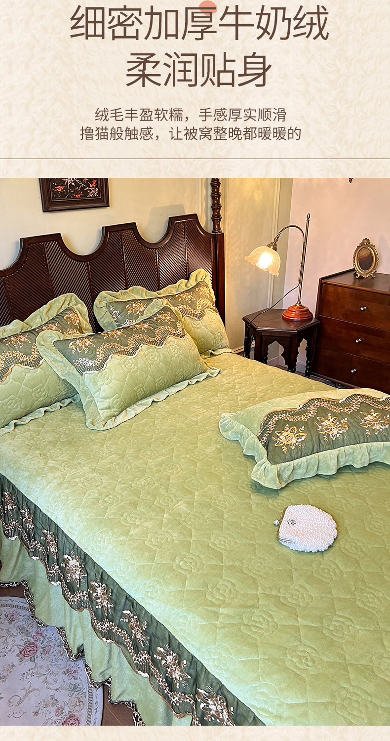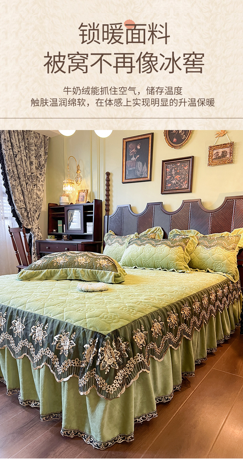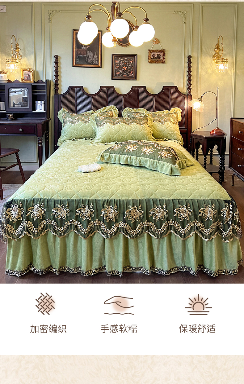 • 91家纺网 家纺一手货源 找家纺 网红馆(ck家纺) 2025新款高克重牛奶绒单床裙 床裙单件卡妮娜系列 卡妮娜-绿色
