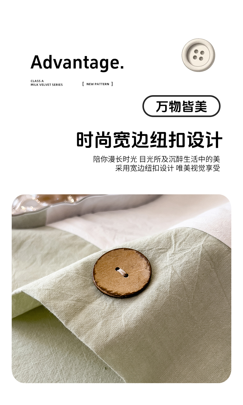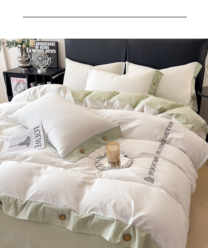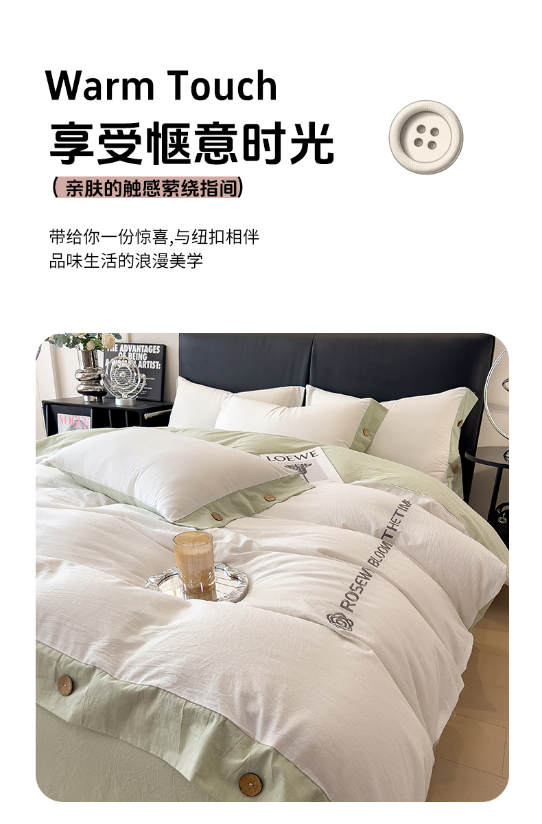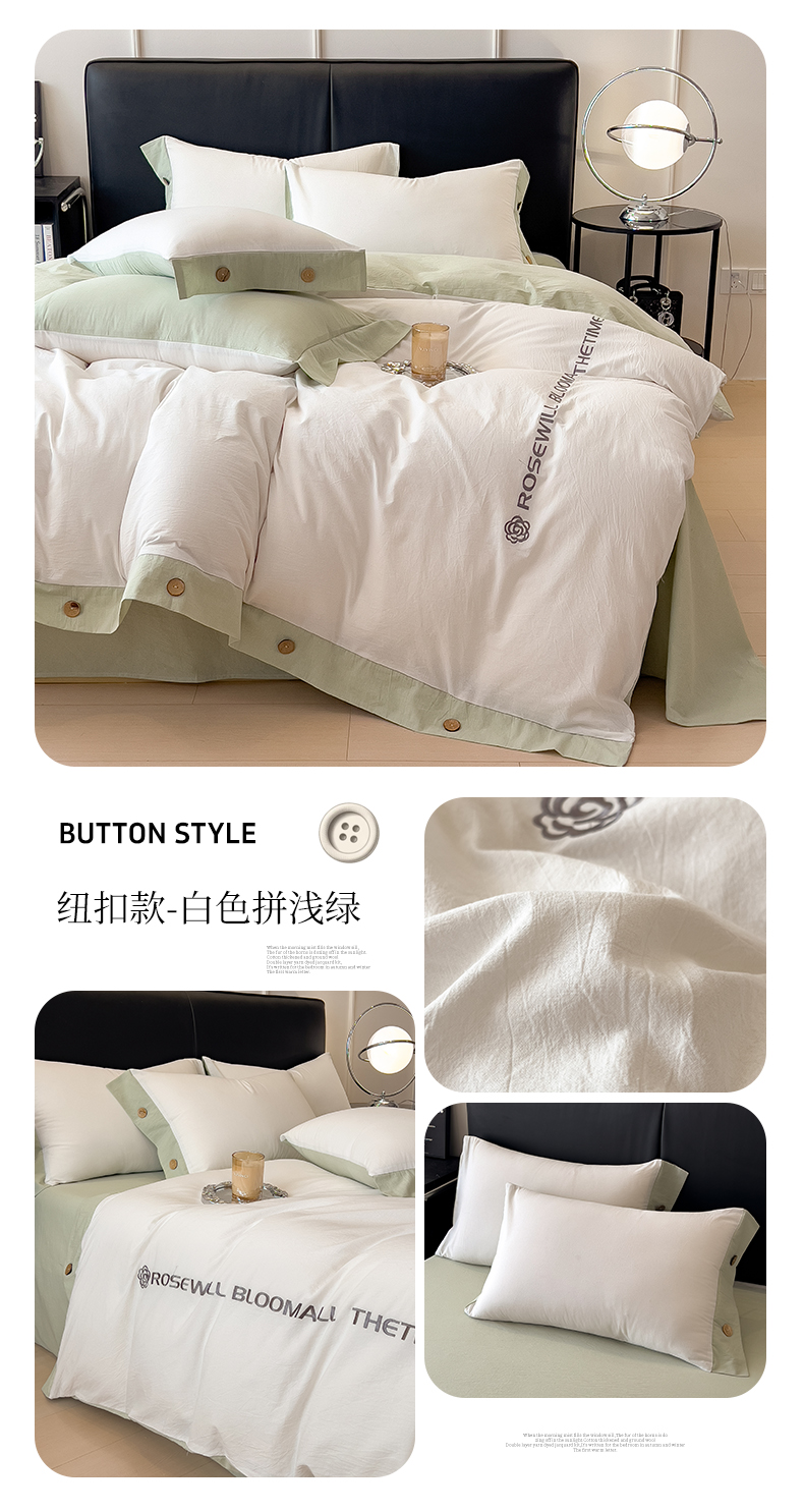 芃成家纺 2025新款A类全棉色织水洗棉纽扣绣花四件套 纽扣款-白色拼浅绿