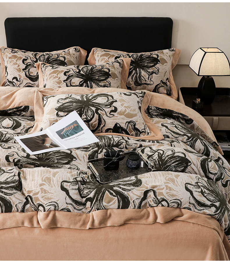三悦四季 2025新款冬季雕花牛奶绒加厚保暖四件套复古风轻奢烂花床单被套床上用品 优雅花卉-黑棕
