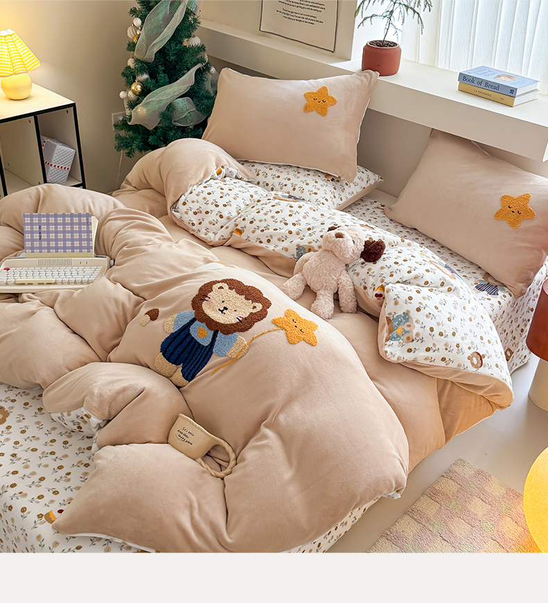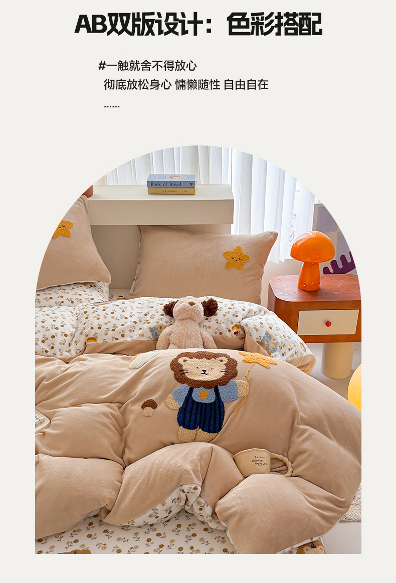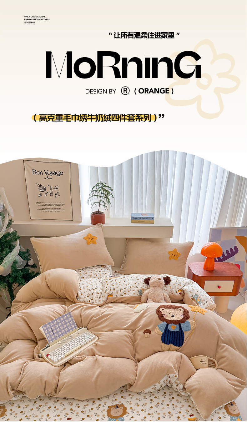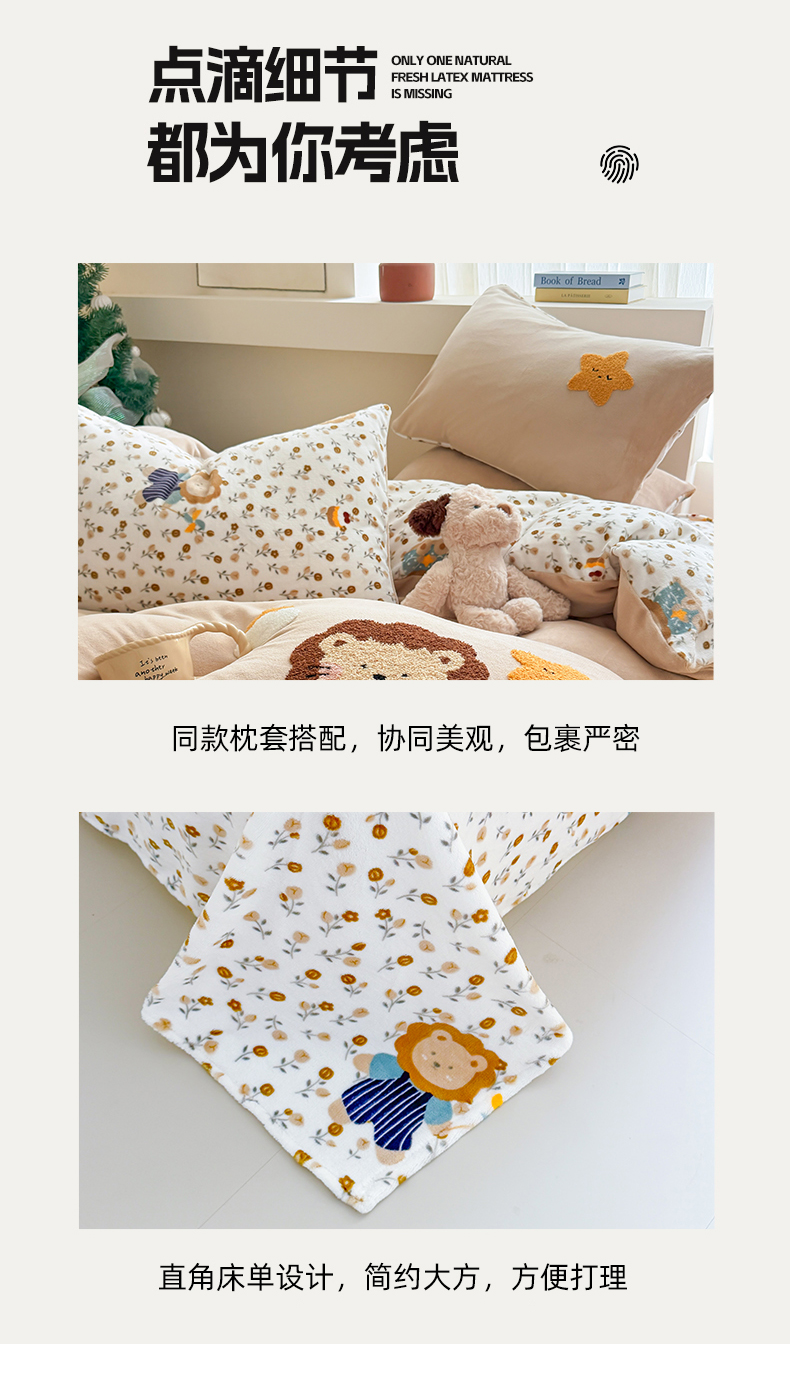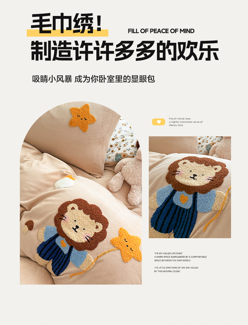 商品名称:艾特你 2025新款毛巾绣200克牛奶绒卡通毛巾绣四件套 小狮子
