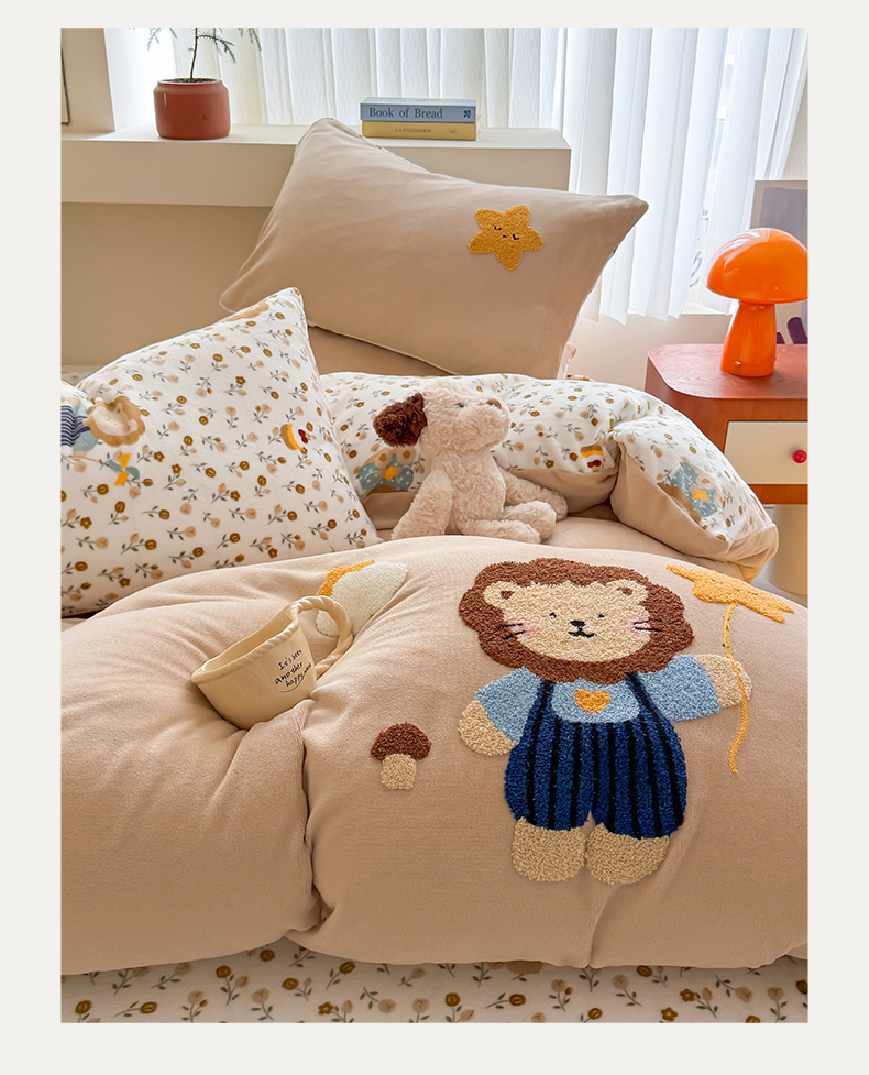 艾特你 2025新款毛巾绣200克牛奶绒卡通毛巾绣四件套 小狮子