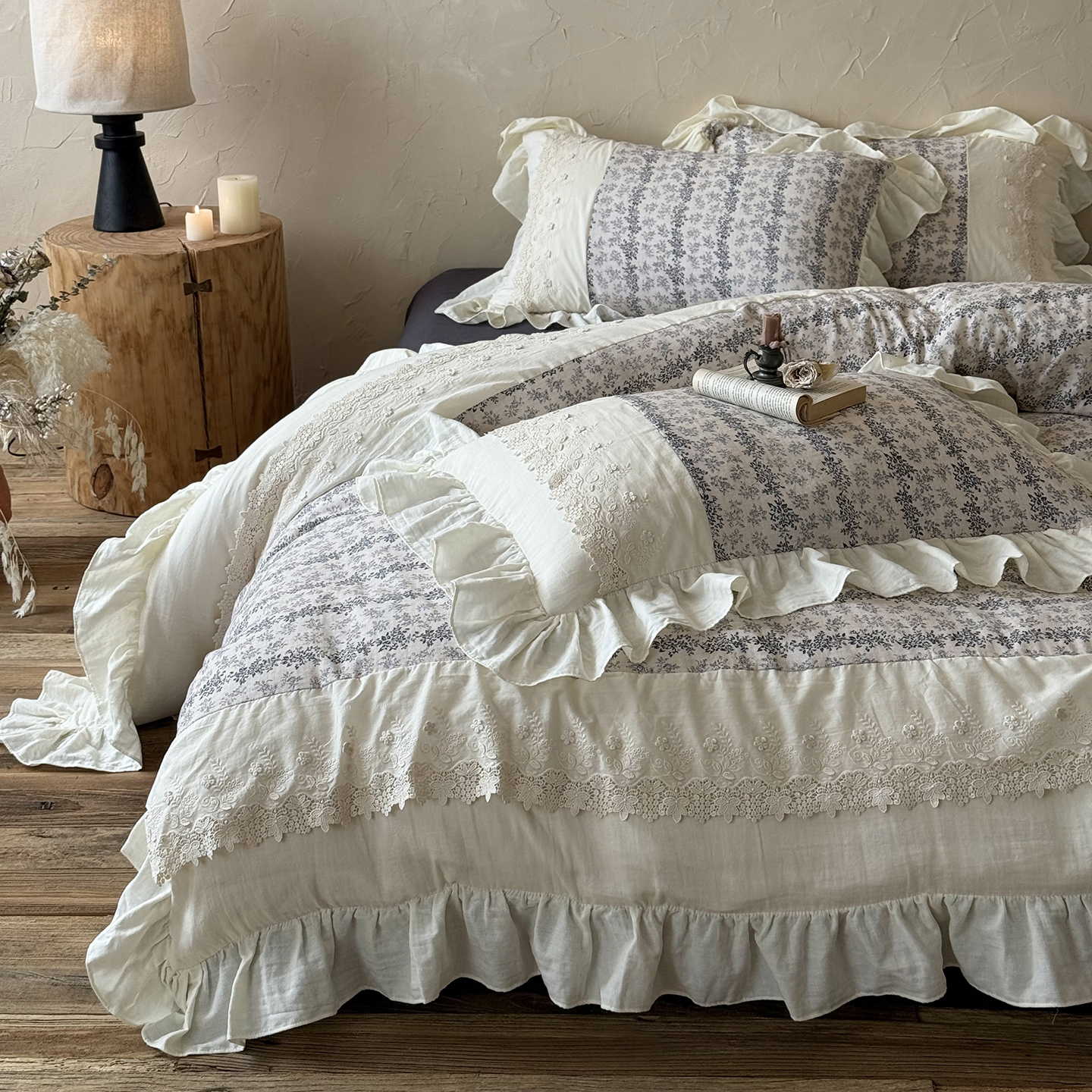 (总)佳汐蓝 2025春夏新品双层皱皱纱刺绣+织带+荷叶边四件套--白茶花,奶白,曲奇