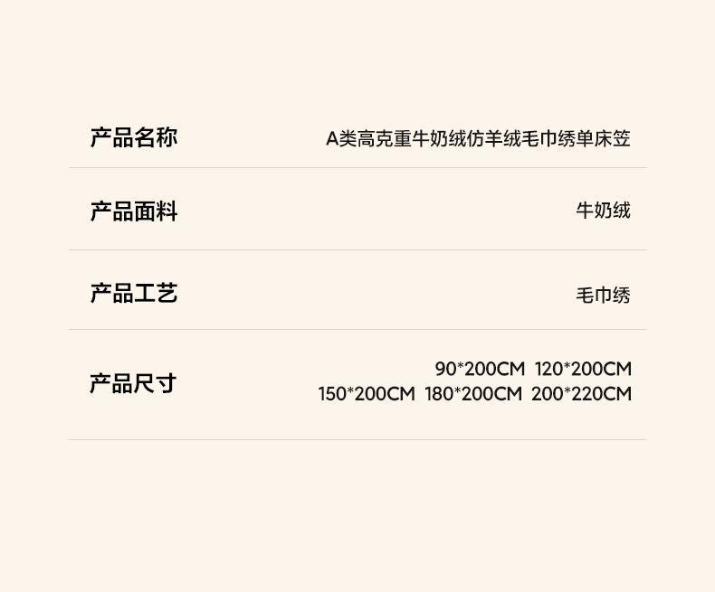 商品名称:(总)早晨家纺 2025新款华泰款高克重牛奶绒仿羊绒毛巾绣单床笠