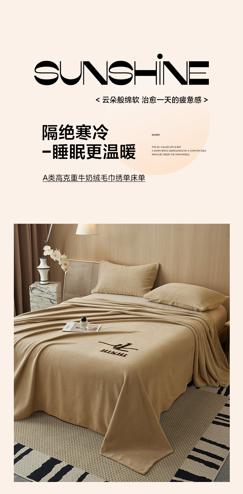 当前位置: 91家纺网 > 商品网购 > 床上用品 > 床单 > 早晨家纺 2025新款牛奶绒纯色毛巾绣暖绒床单 时尚-米驼