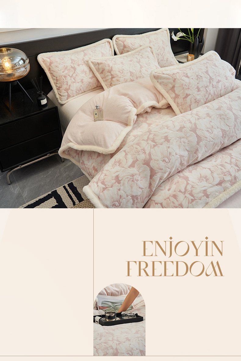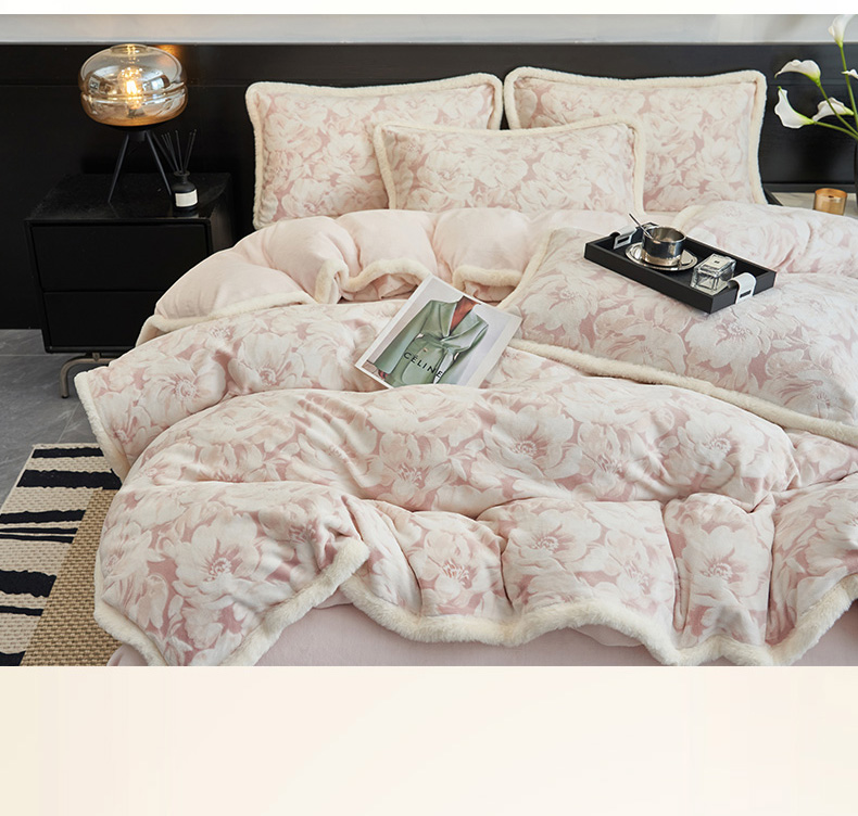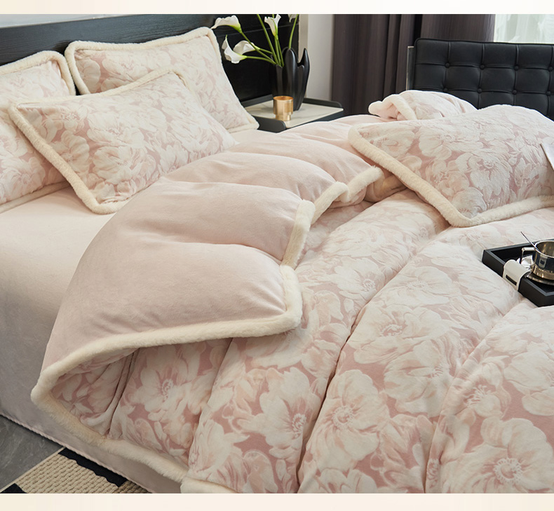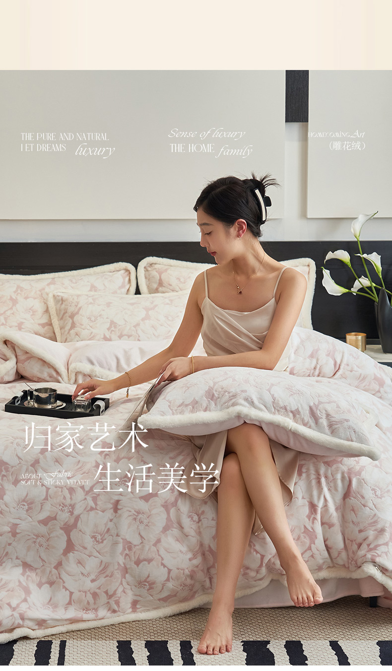 (总)金鹰 2025新款A类雕花牛奶绒烂花兔毛包边四件套,羽毛,波澜壮阔,繁花,蝴蝶梦,简爱,兰花,玫瑰物语,梦幻森林,清晨玫瑰,羽叶,仲夏晨歌