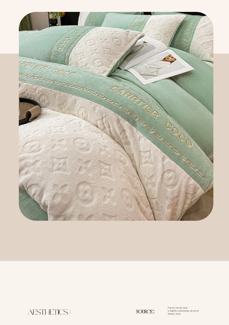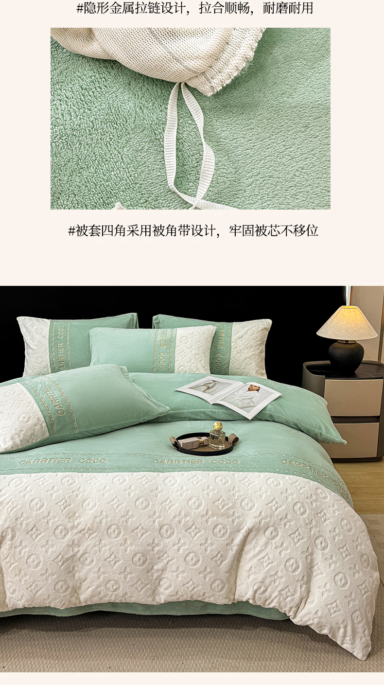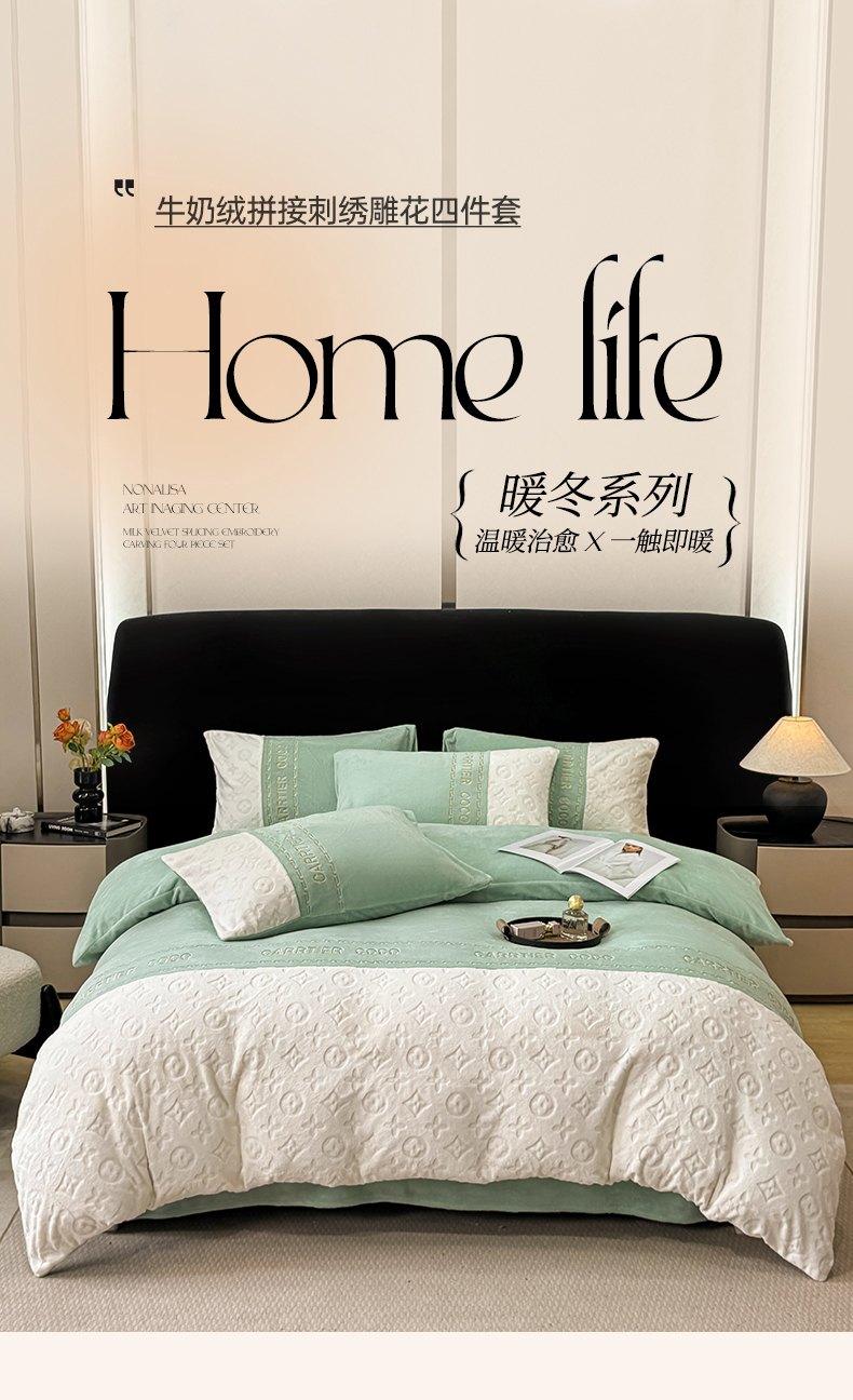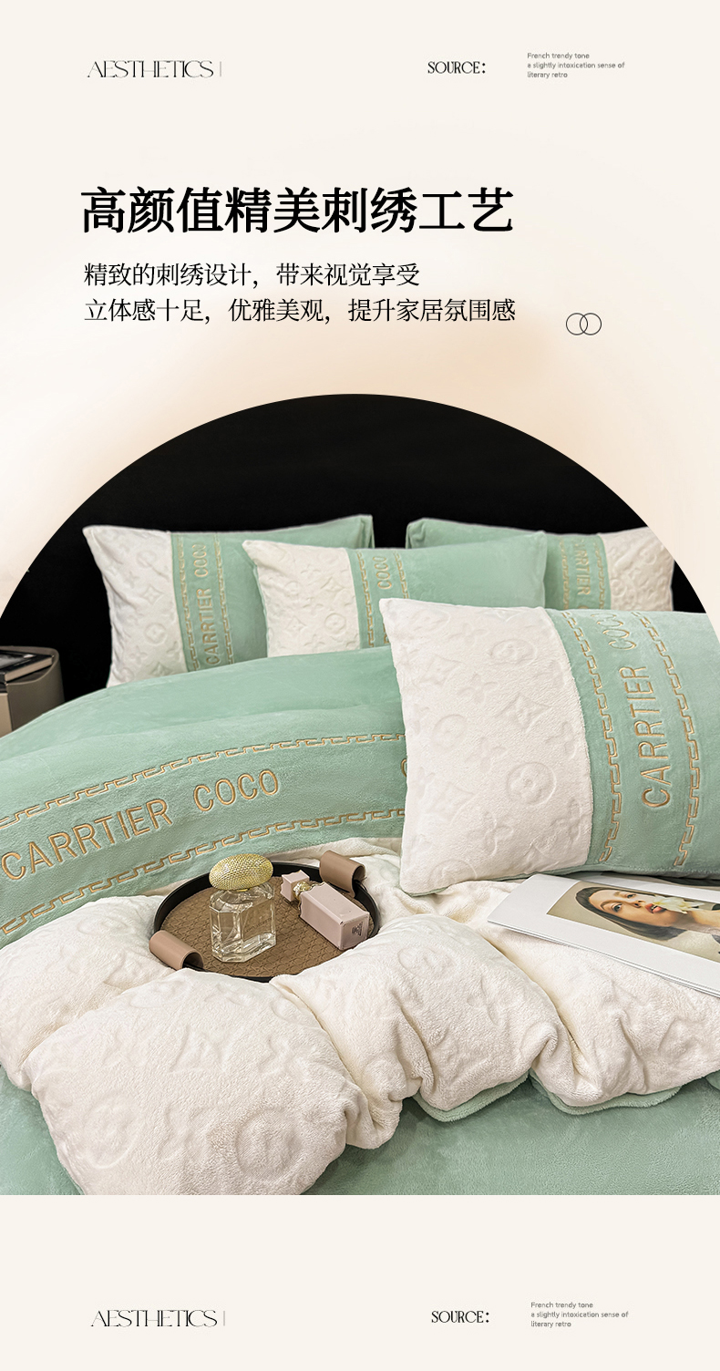当前位置: 91家纺网 > 商品网购 > 床品套件 > 四件套 > 牛奶绒四件套 > 灰鲸 2025新款牛奶绒拼接刺绣雕花四件套-威登 威登-抹茶绿
