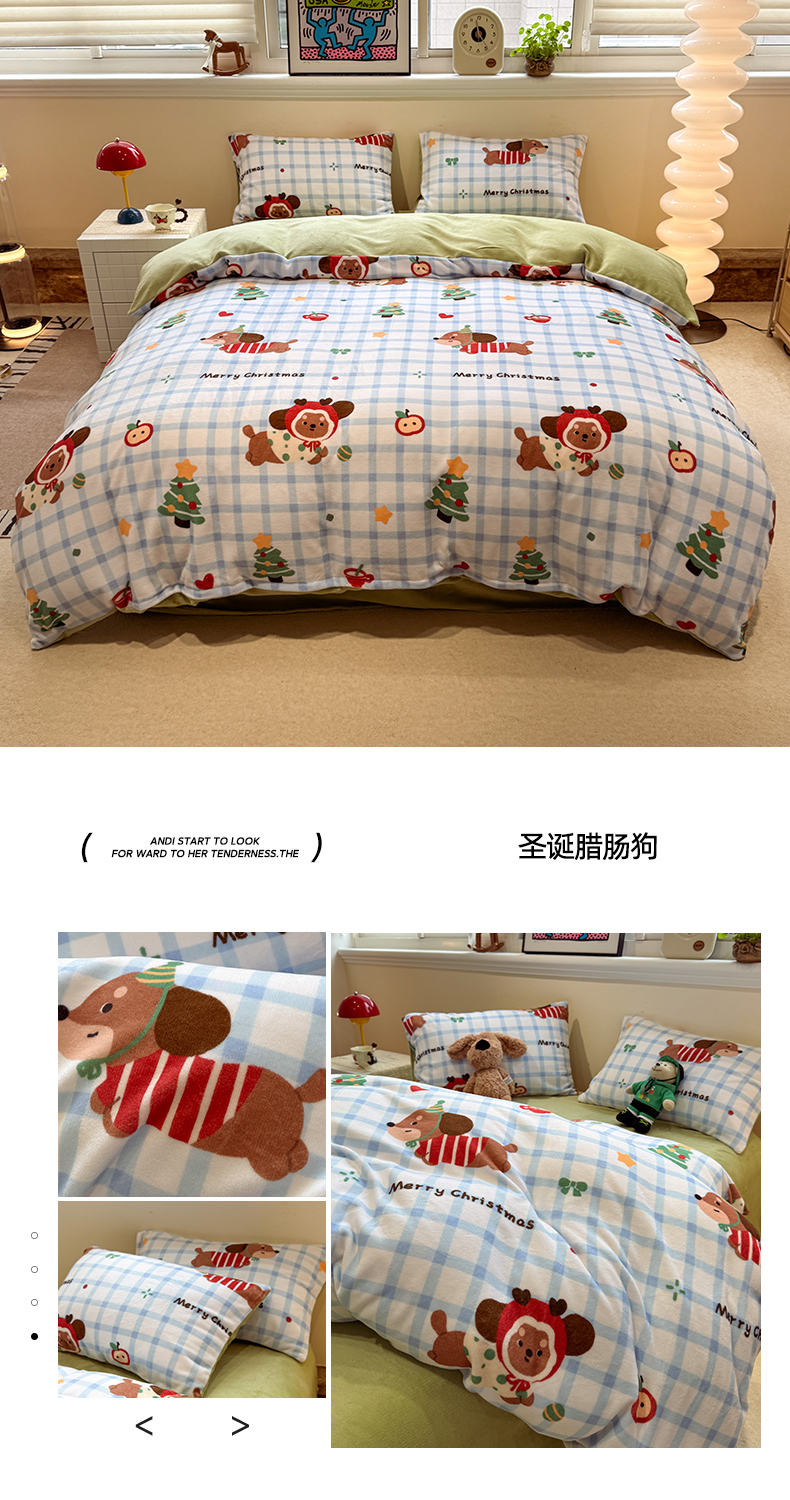 商品名称:呗旺鹿 2025新款A类牛奶绒数码印花卡通小清新四件套(场景一) 圣诞腊肠狗