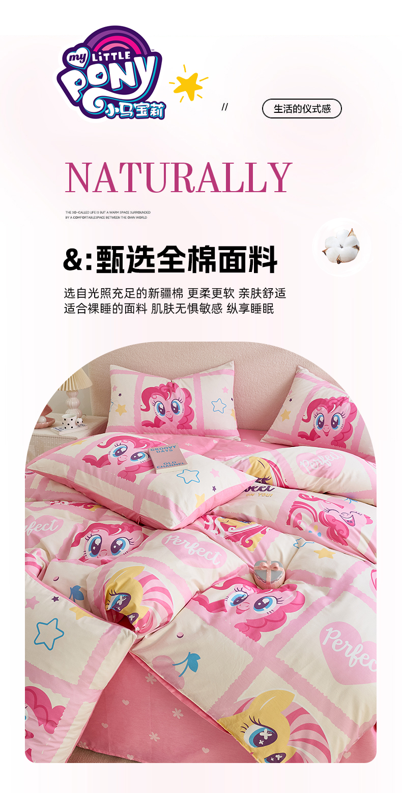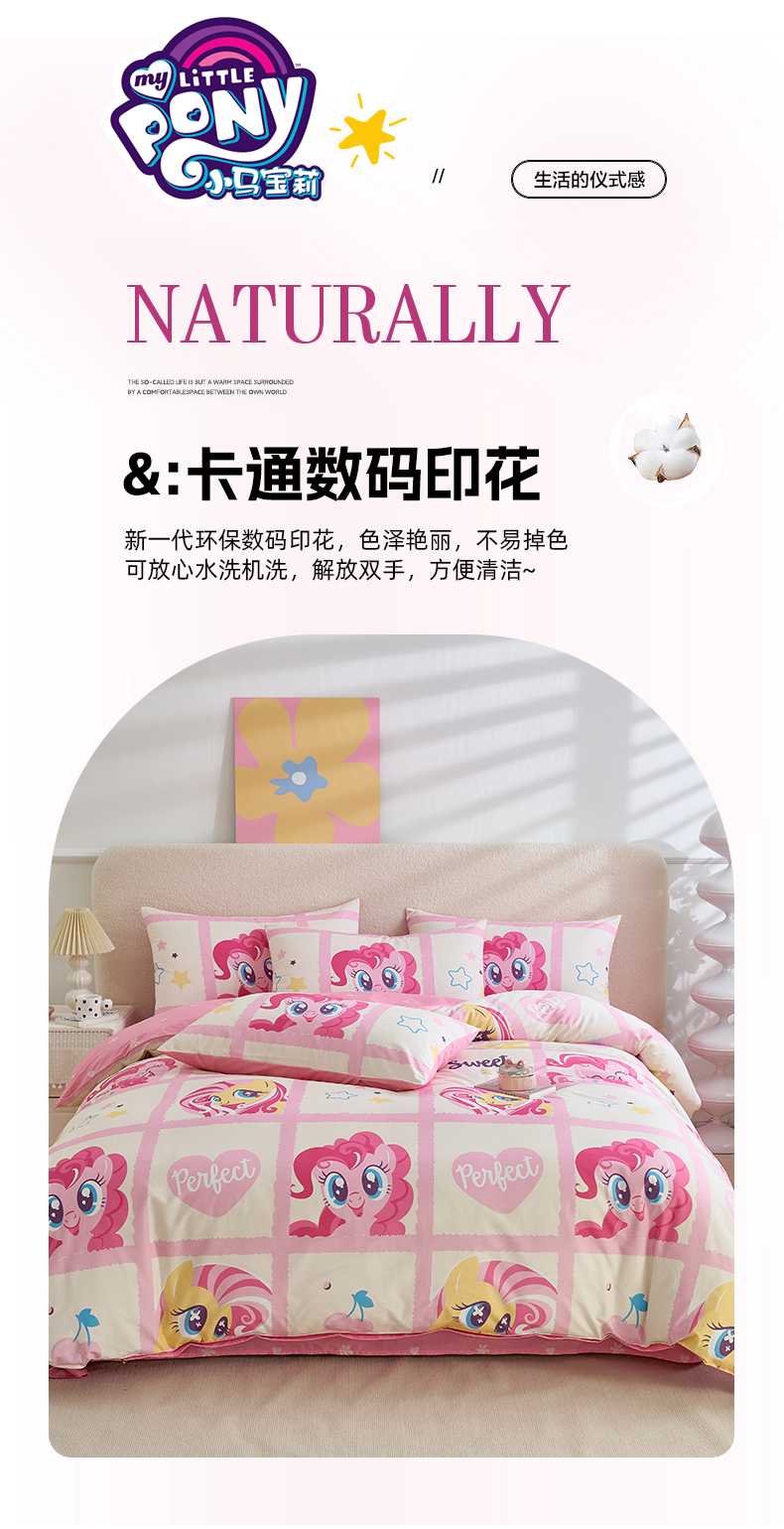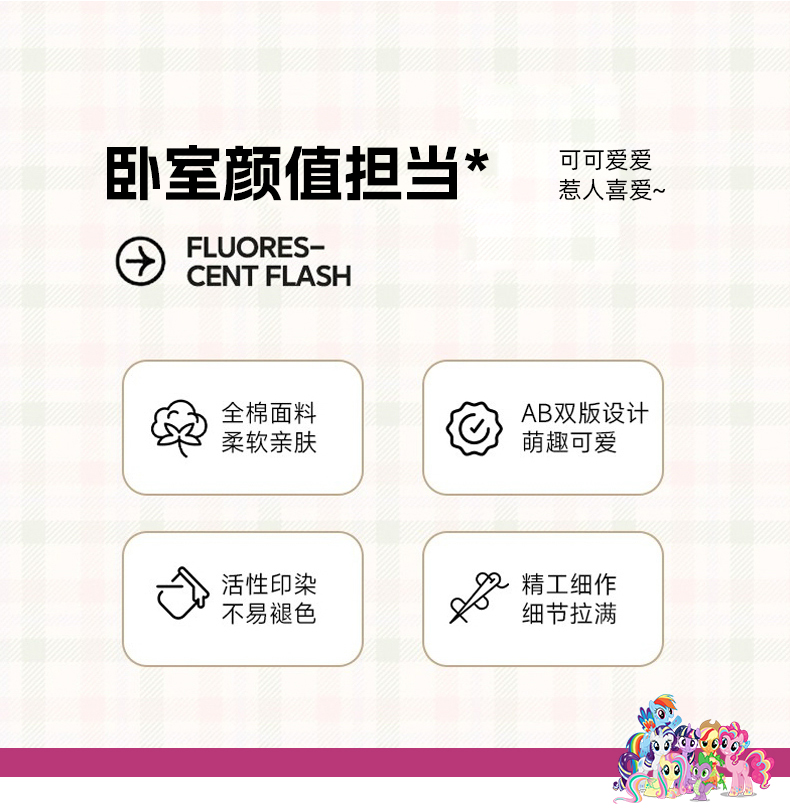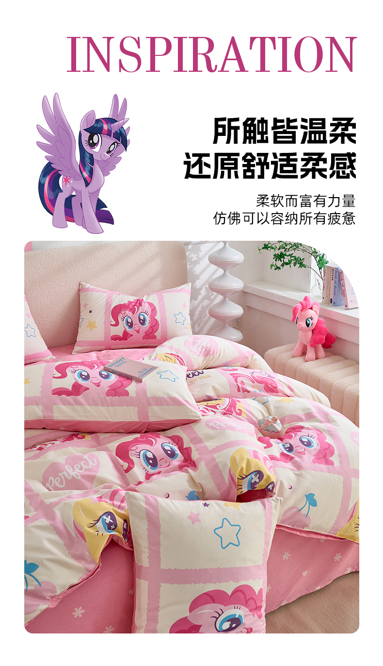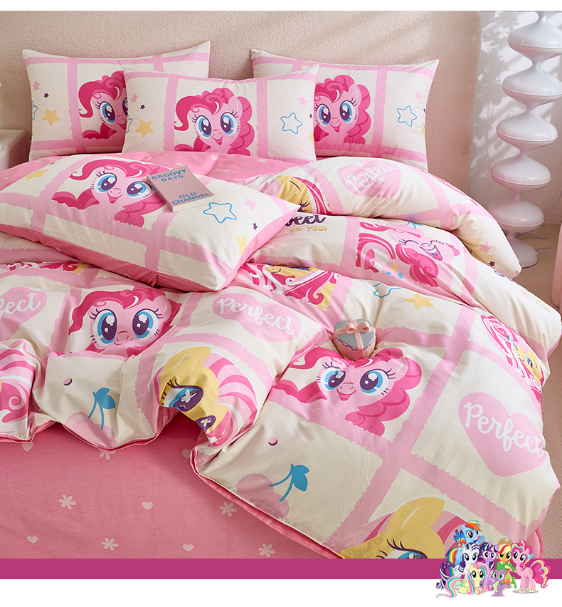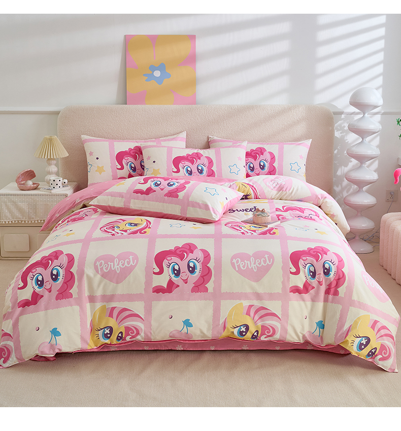 当前位置: 91家纺网 > 商品网购 > 床品套件 > 四件套 > 全棉普通四件套 > 百利卡通(原迪士尼家纺) 2025新款小马宝莉全棉纯棉数码印花圆网四件套 格子小马