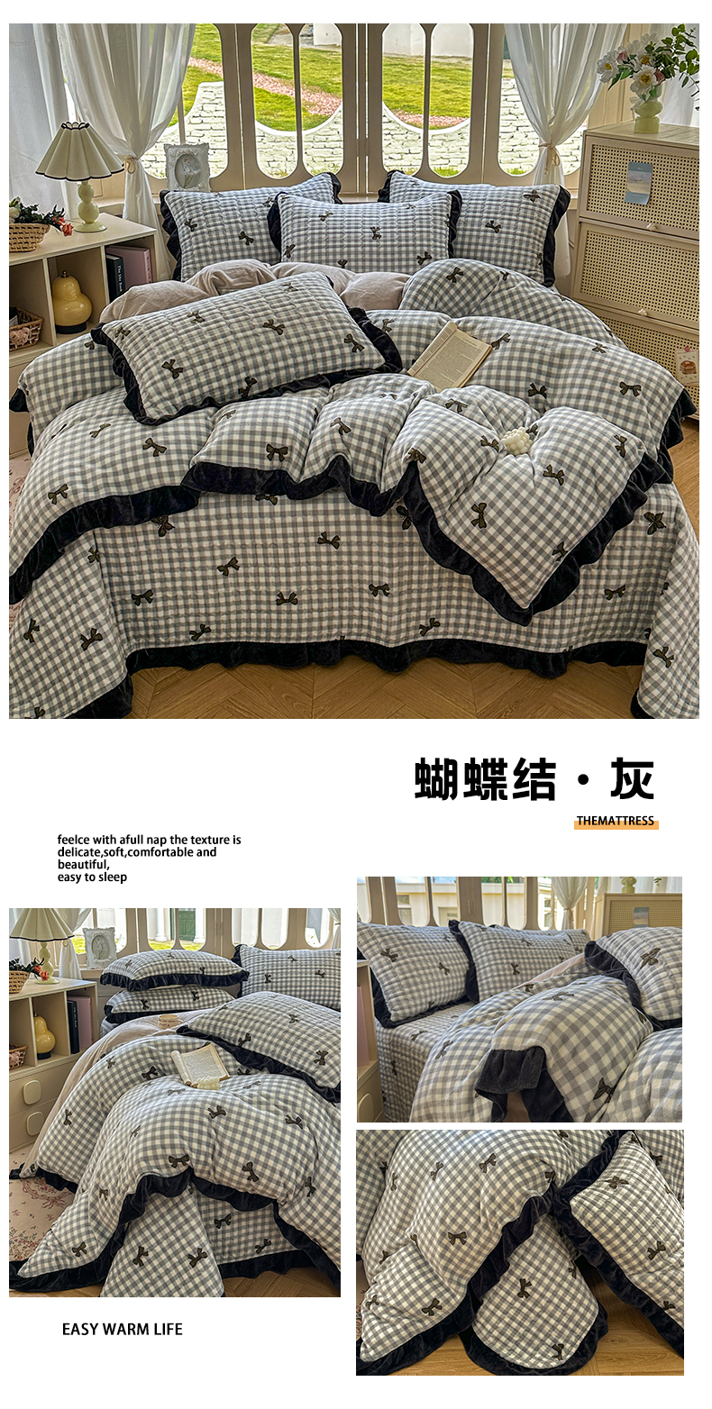 商品名称:美梦家纺 2025新款牛奶绒花边夹棉床盖四件套 蝴蝶结-灰
