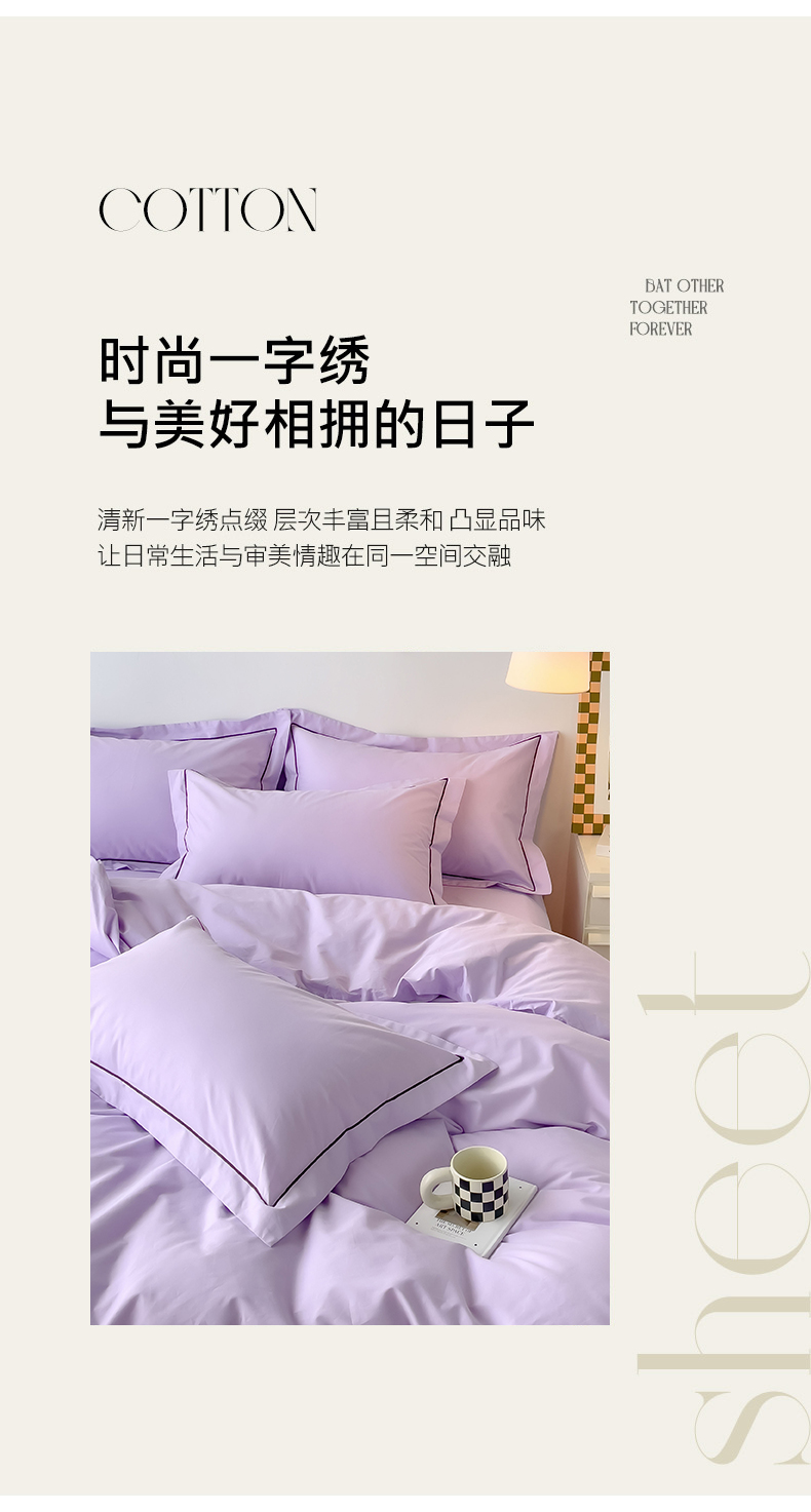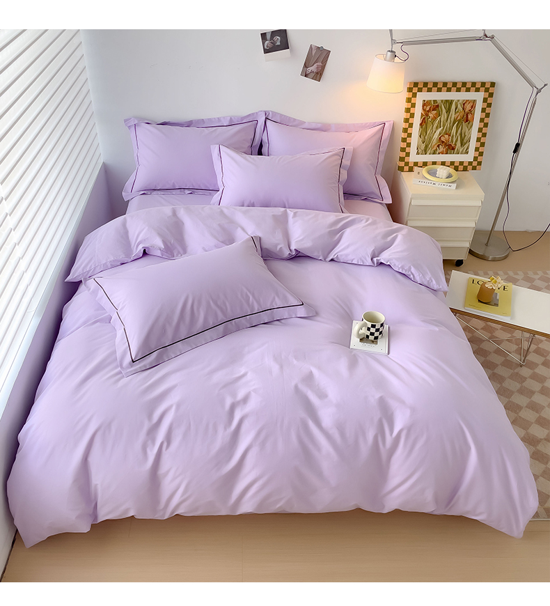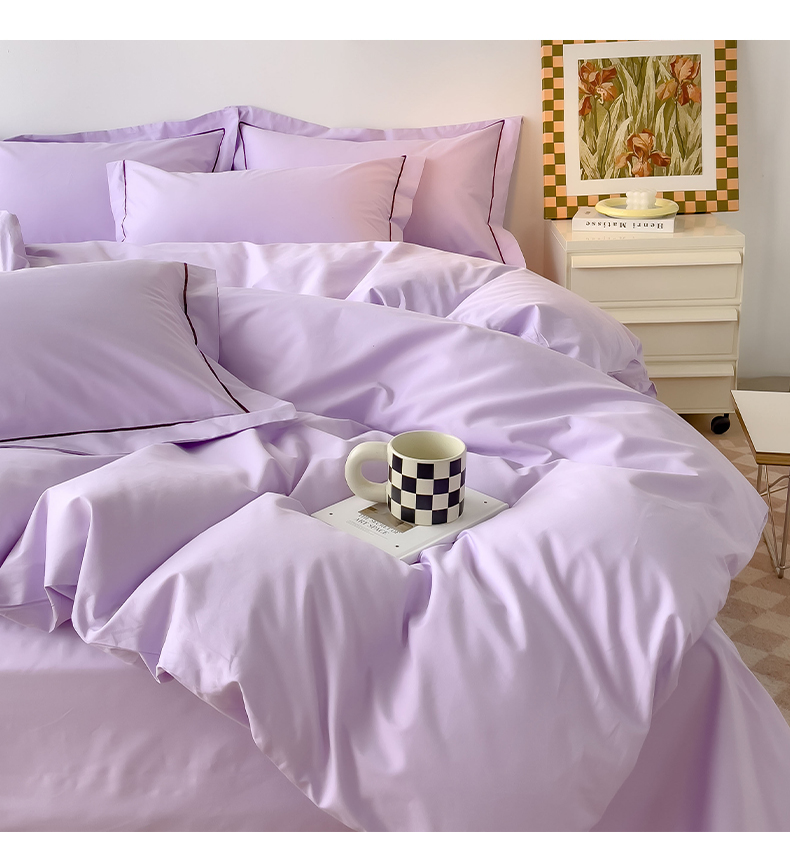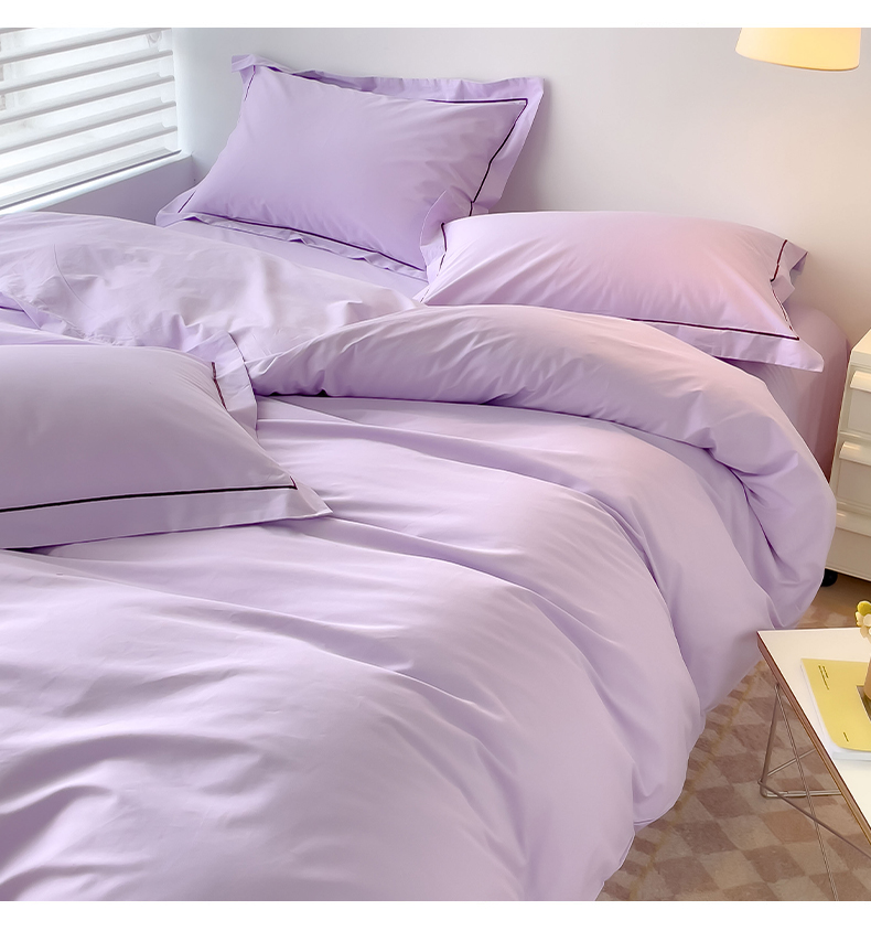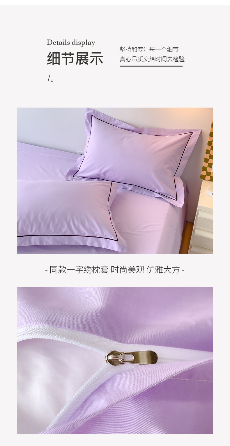 当前位置: 91家纺网 > 商品网购 > 床品套件 > 四件套 > 全棉普通四件套 > 锦彩家居 2026新款40支正宗13372双拼纯色全棉四件套酒店宾馆民宿学生三件套(可定制)标准号的床单是圆角吊边;小号和加大的床单都是直角 浅紫