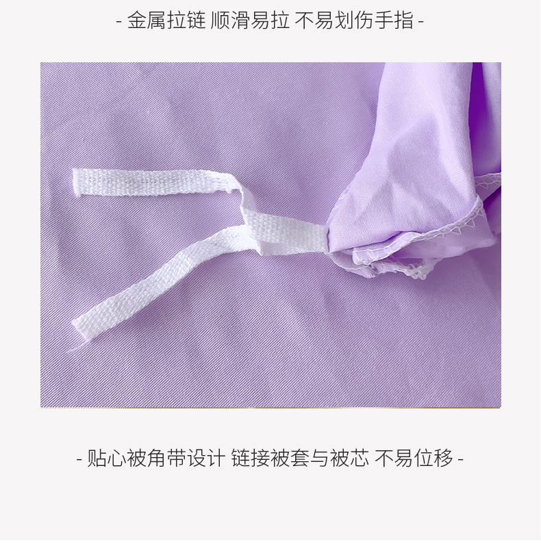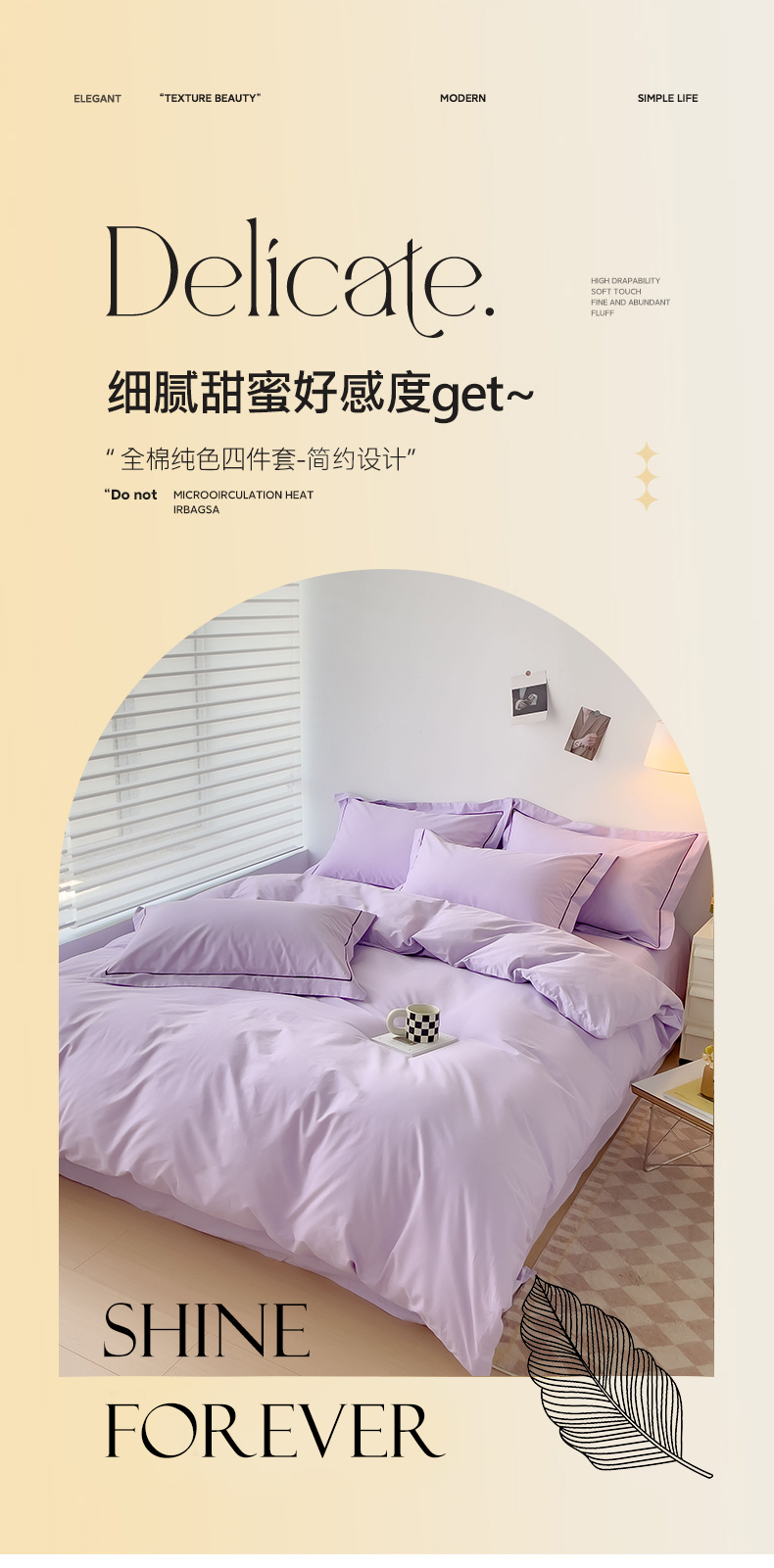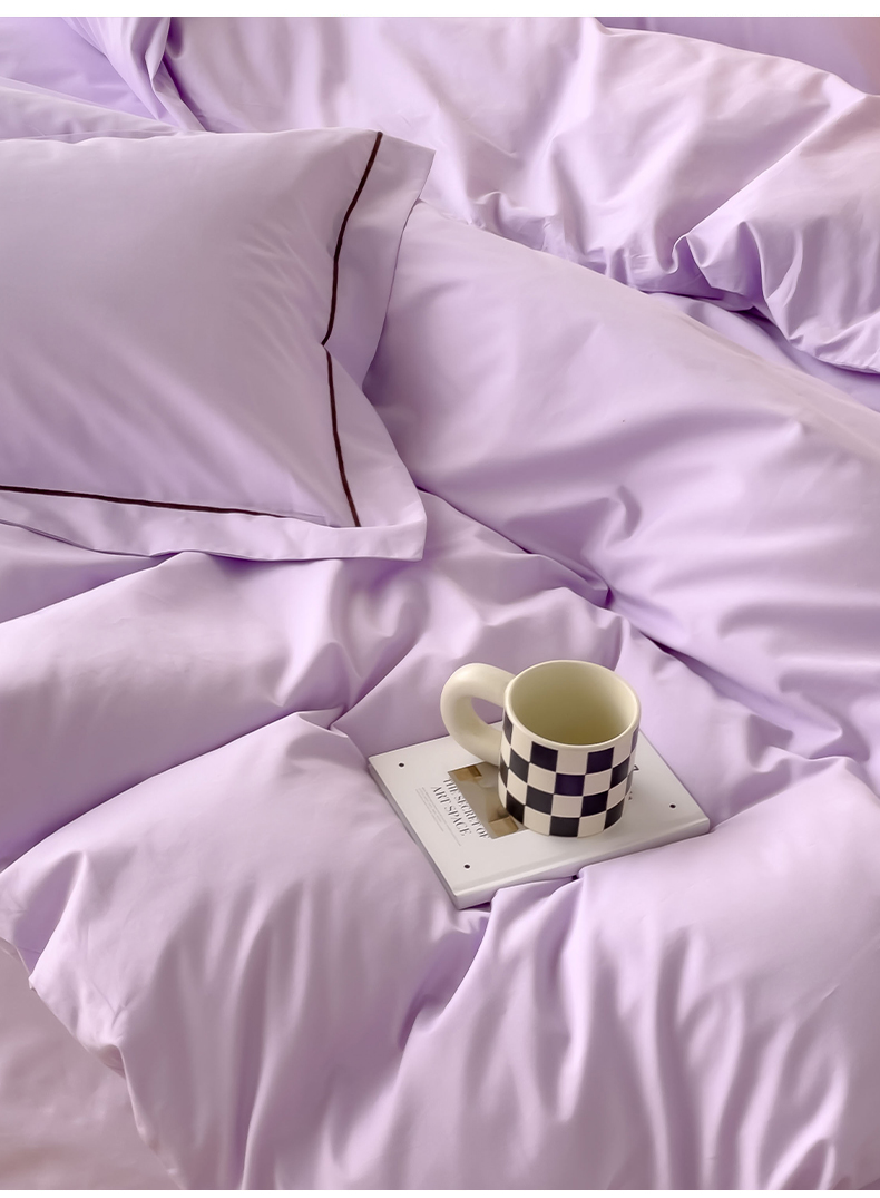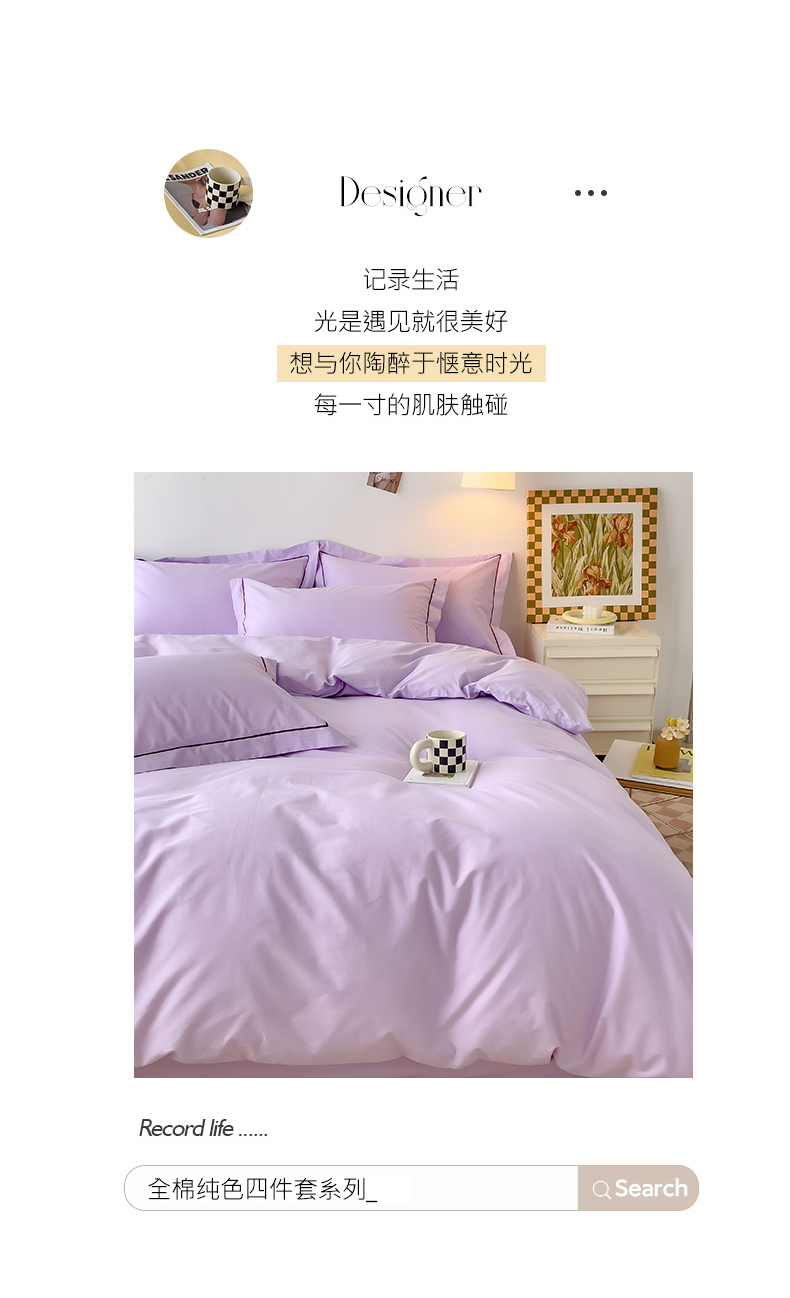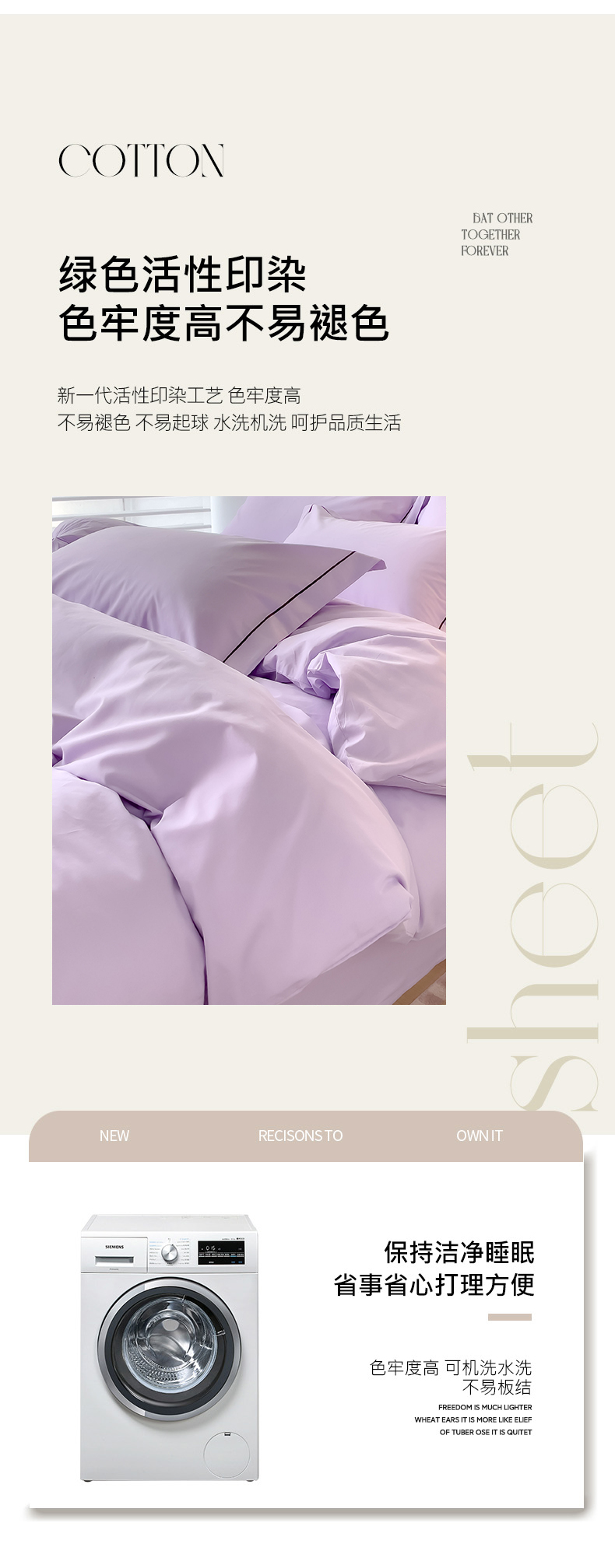 当前位置: 91家纺网 > 商品网购 > 床品套件 > 四件套 > 全棉普通四件套 > 锦彩家居 2026新款40支正宗13372双拼纯色全棉四件套酒店宾馆民宿学生三件套(可定制)标准号的床单是圆角吊边;小号和加大的床单都是直角 浅紫