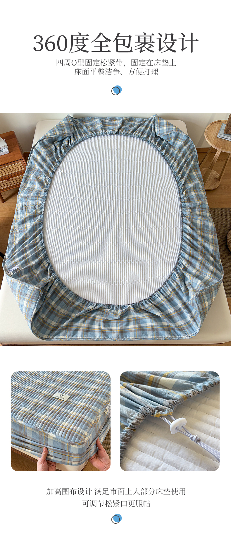 (总)居眠 2026新款全棉色织水洗棉格子夹棉棉花床笠,夹棉款-摩登蓝卡条,夹棉款-摩登绿卡条